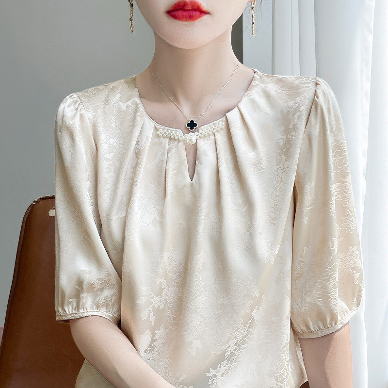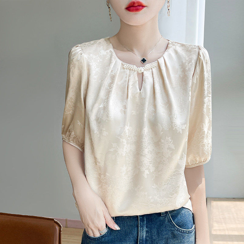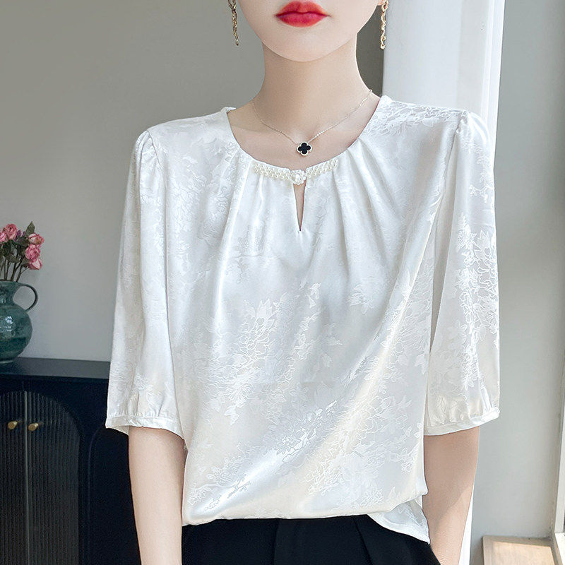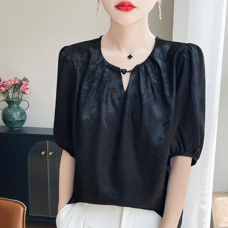 26春季 圆领提花盘扣醋酸真丝小衫 宽松洋气显瘦短袖 上衣女A96 新款