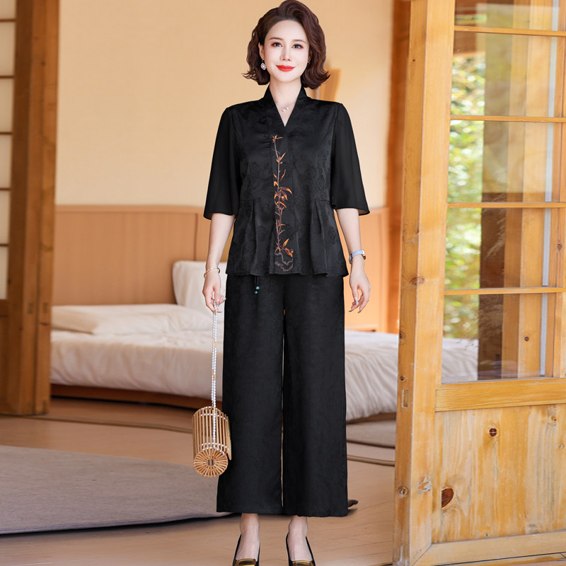 喜婆婆夏季 妈妈气质桑蚕丝两件套女 高贵中老年香云纱真丝t恤套装
