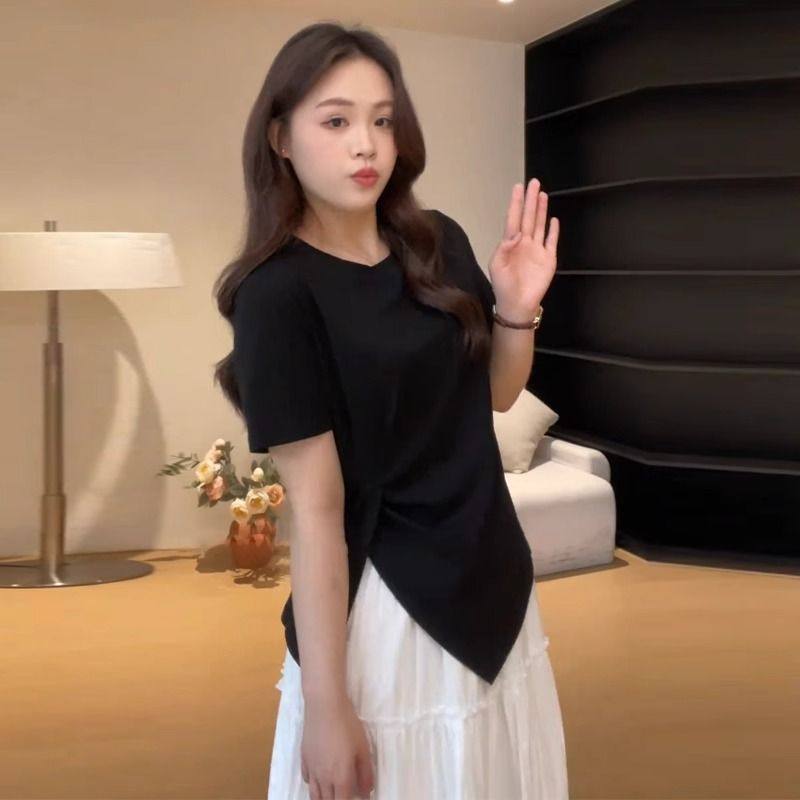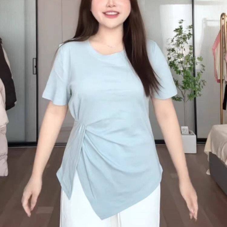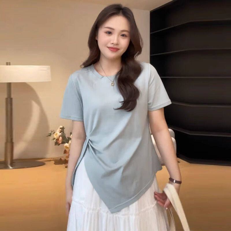 胖mm显瘦开叉百搭正肩短袖 t恤240斤 褶皱收腰不规则上衣女夏季 大码由