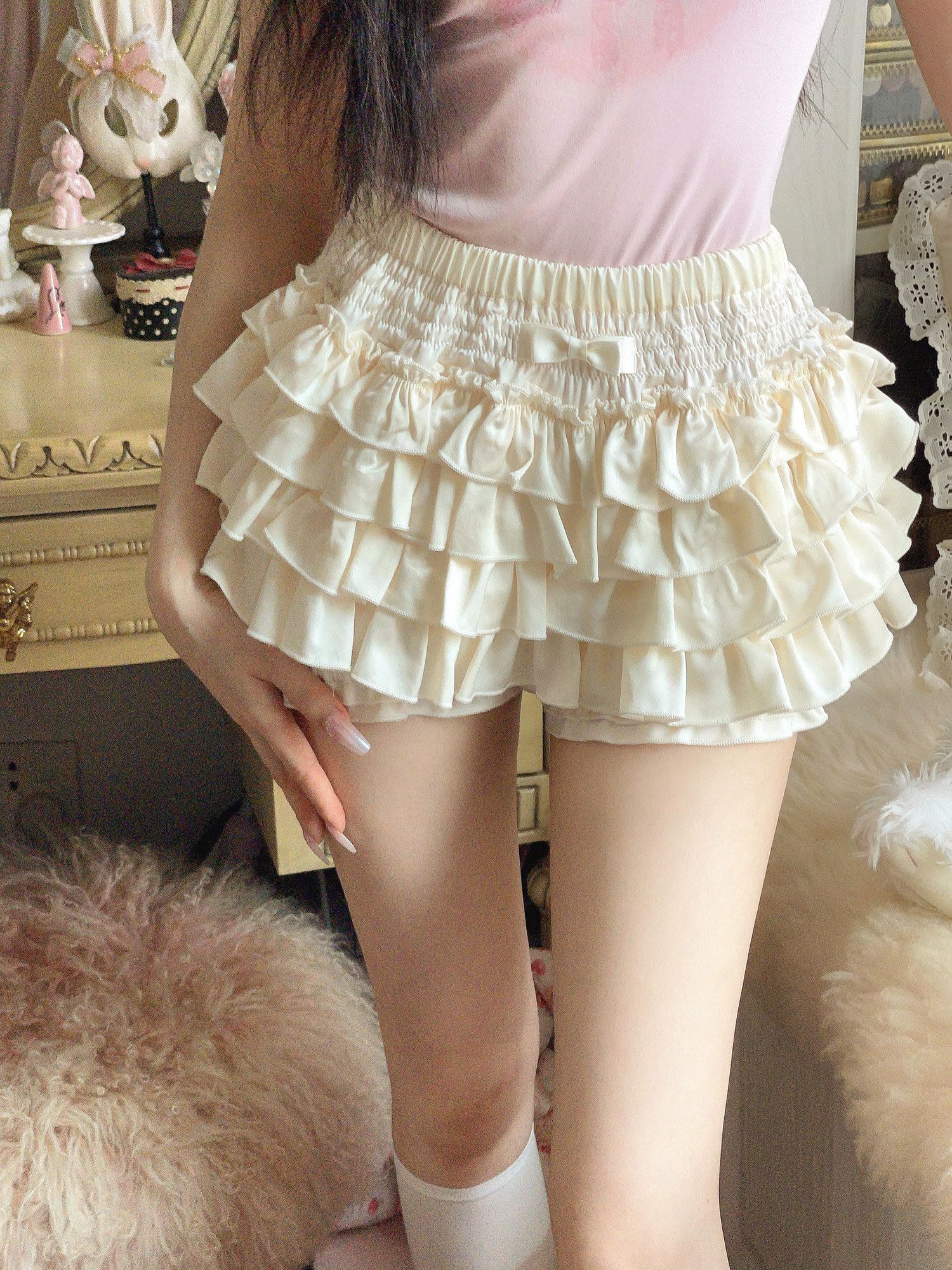 莉摩Bobon21奶油doll感 B2326 显腿长真醋酸缎面层层花边泡泡短裤