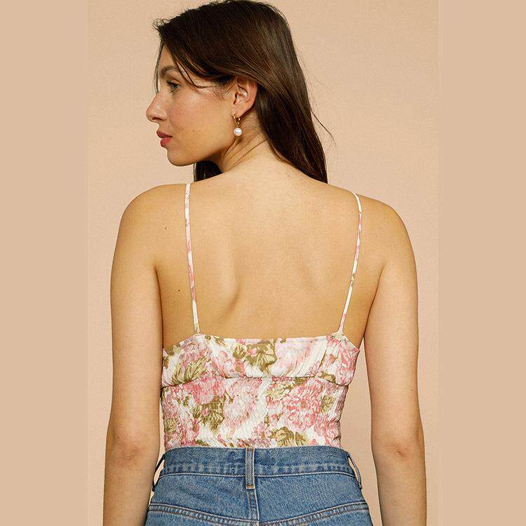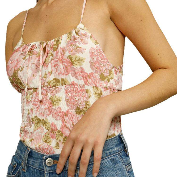 复古风女装 现货345 法式 新款 Rouj 人丝印花吊带清凉上衣2021夏季