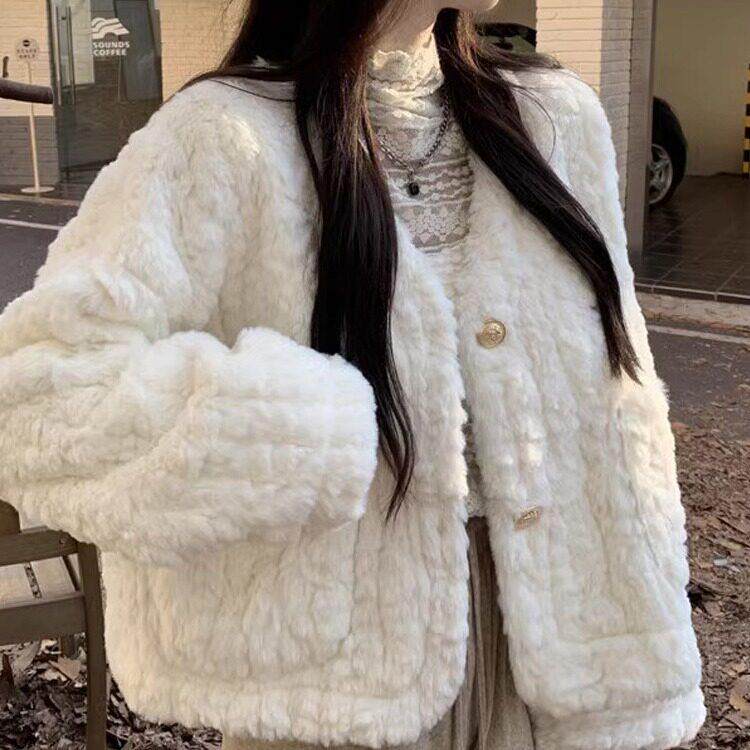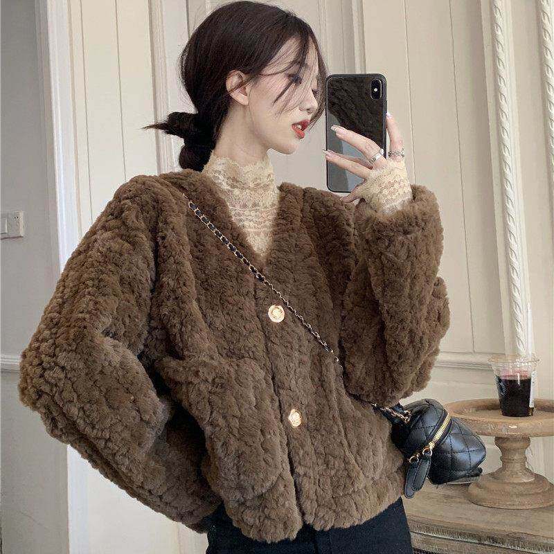 彷羊羔毛外套女秋冬2022新款 设计感V领宽松短款 长袖 棉衣棉服 韩版