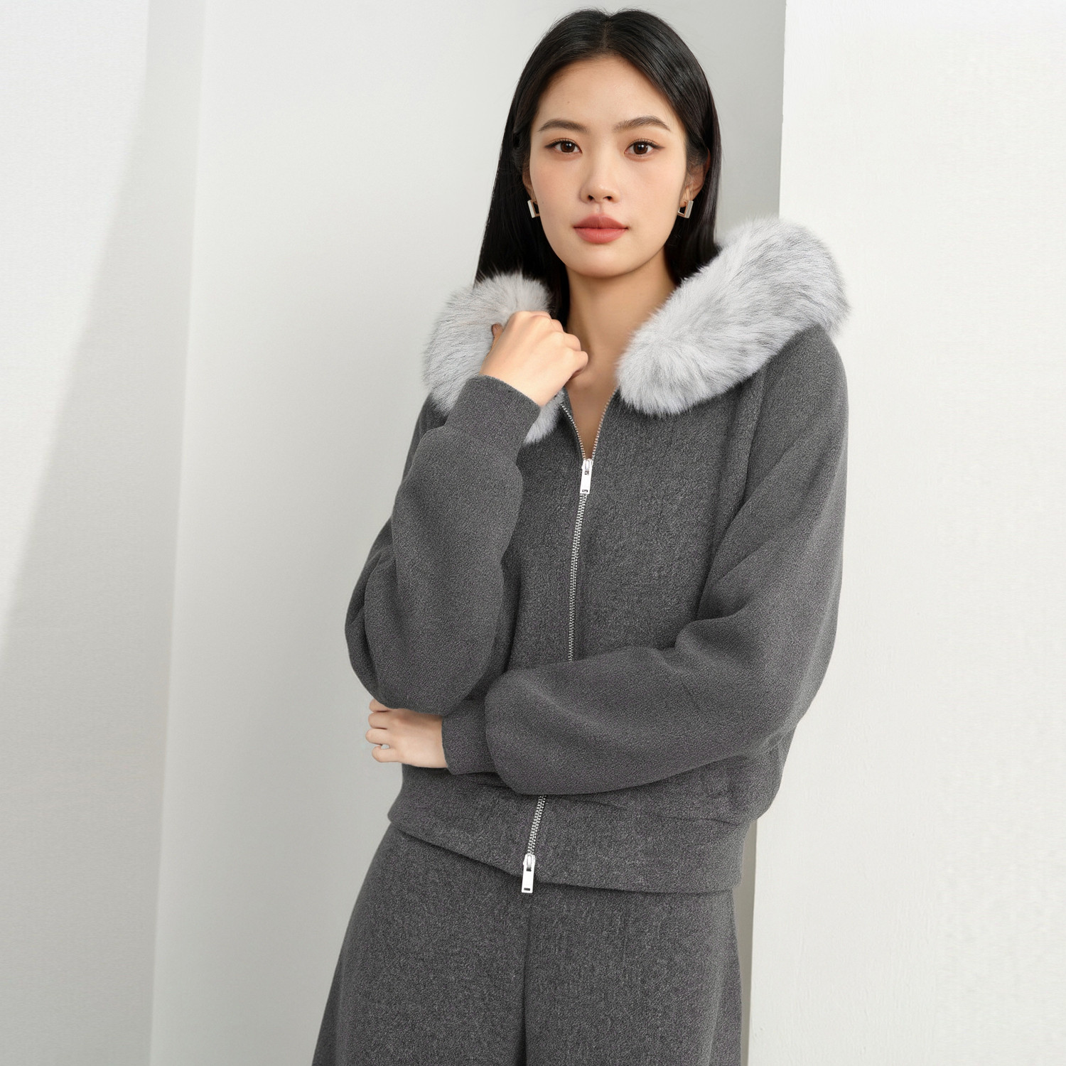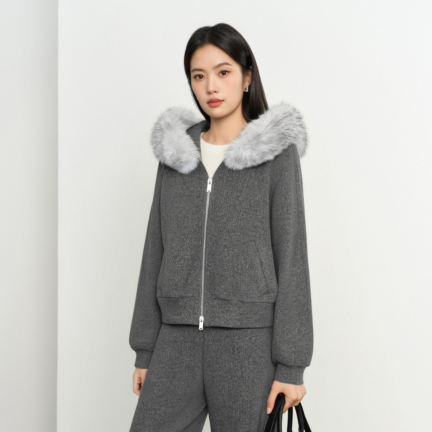 伊芙丽宽松两件套毛领长袖 拉链连帽卫衣套装 26春新品 朱珠代言由