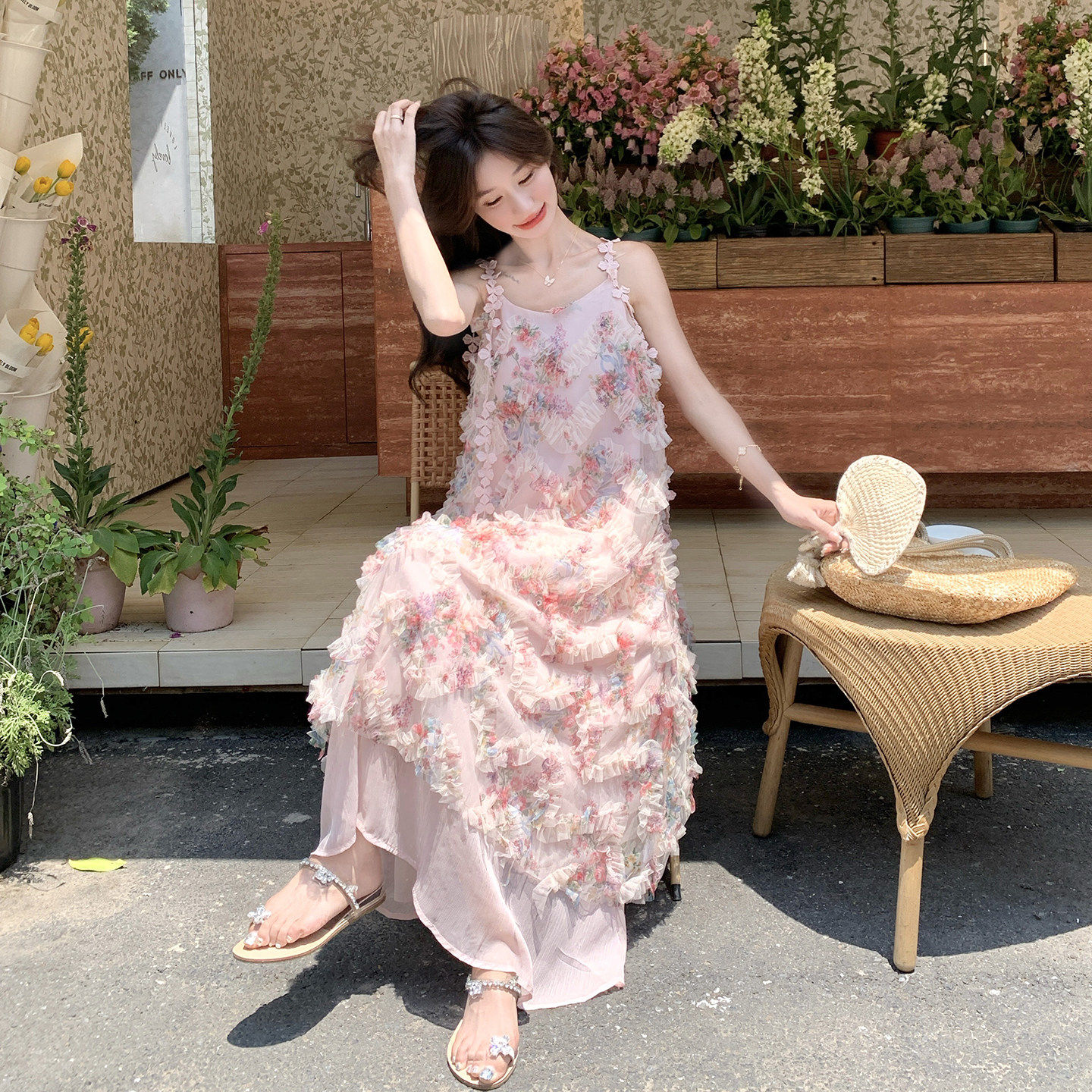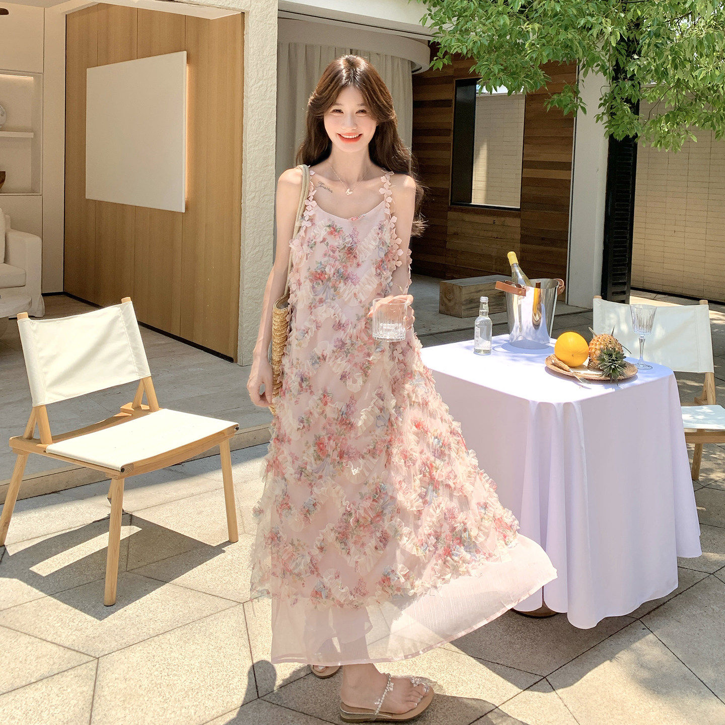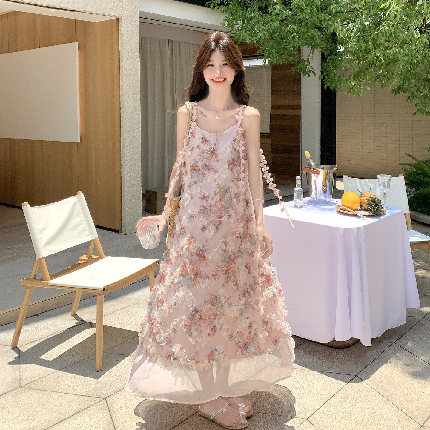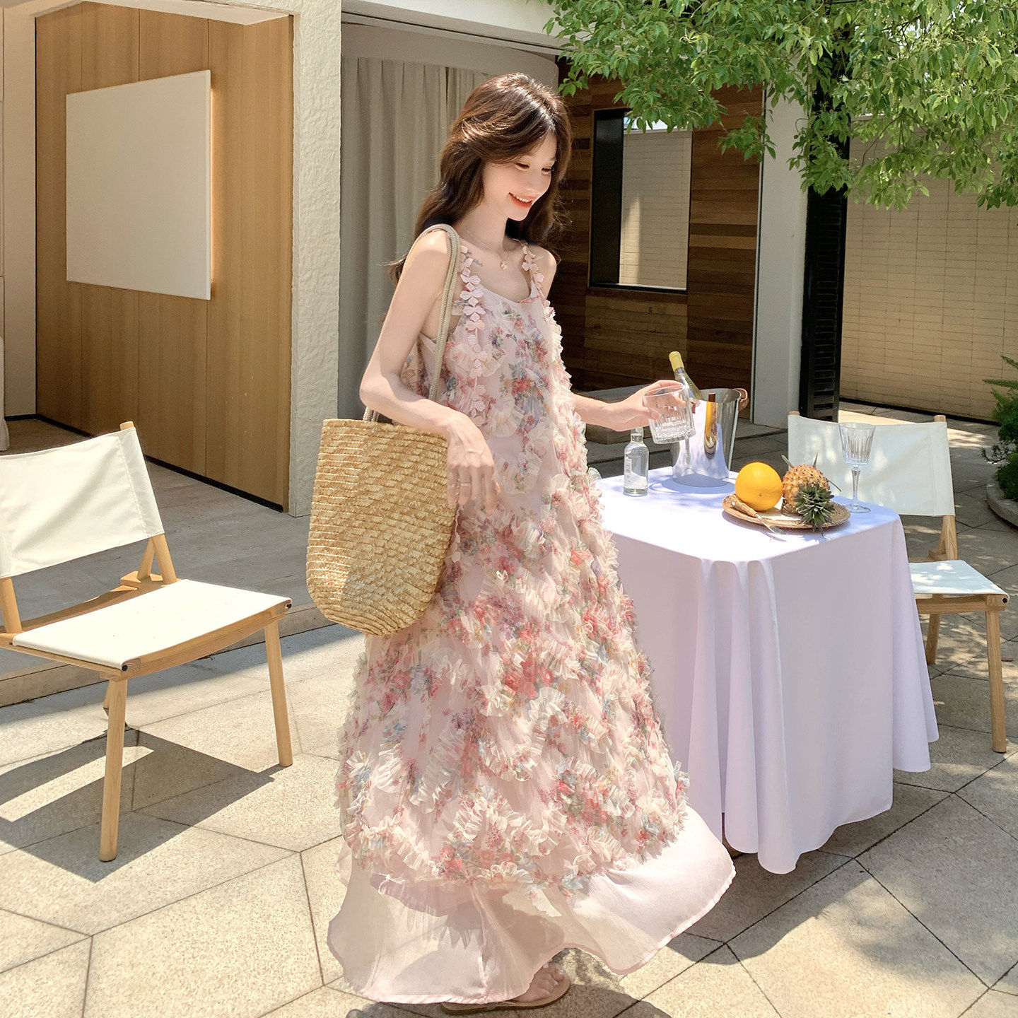 新款 超仙少女感吊带裙 女2025夏季 粉色绝美浪漫风木耳边碎花洋装