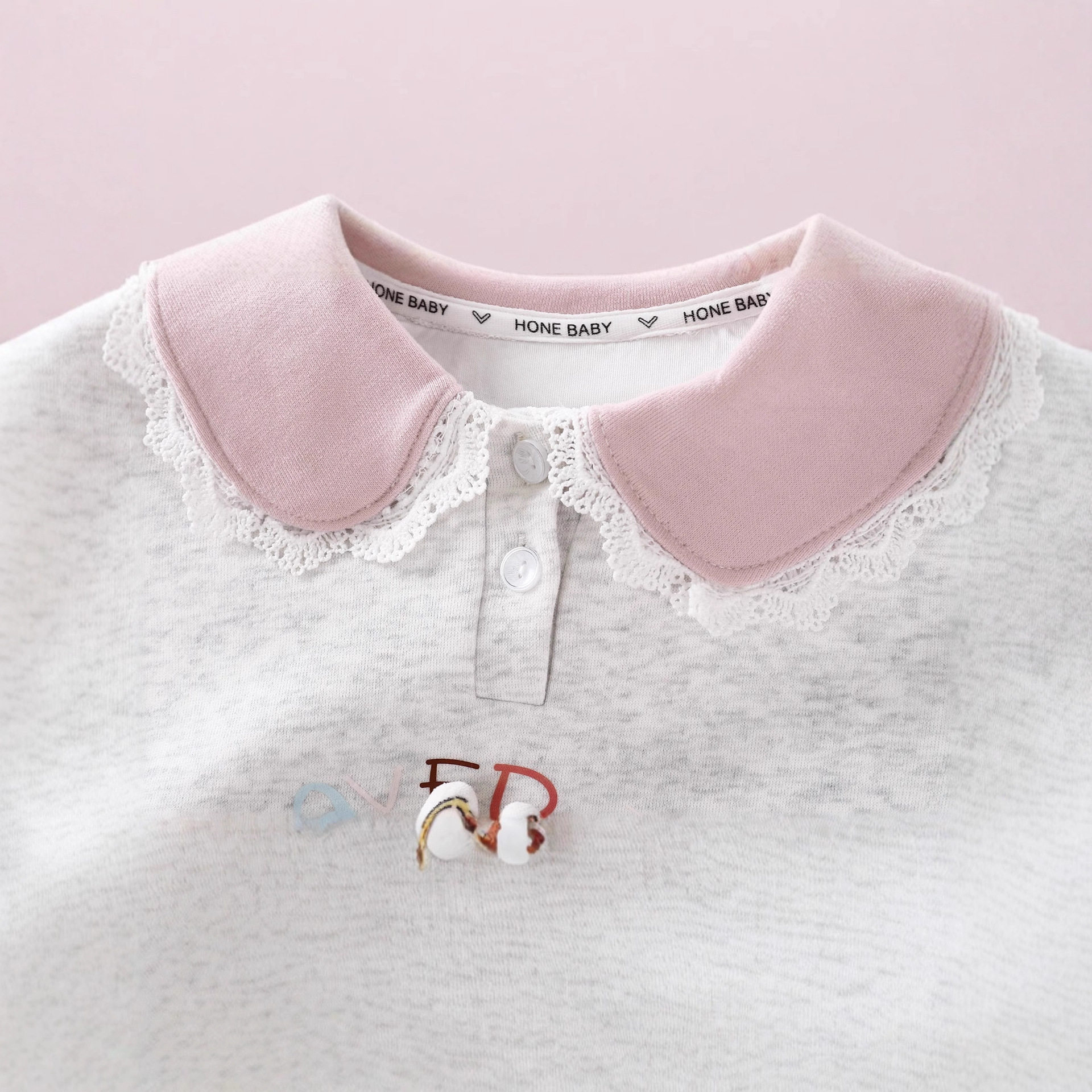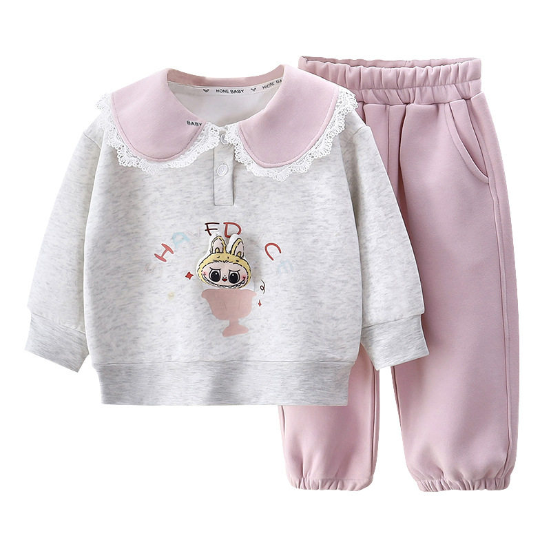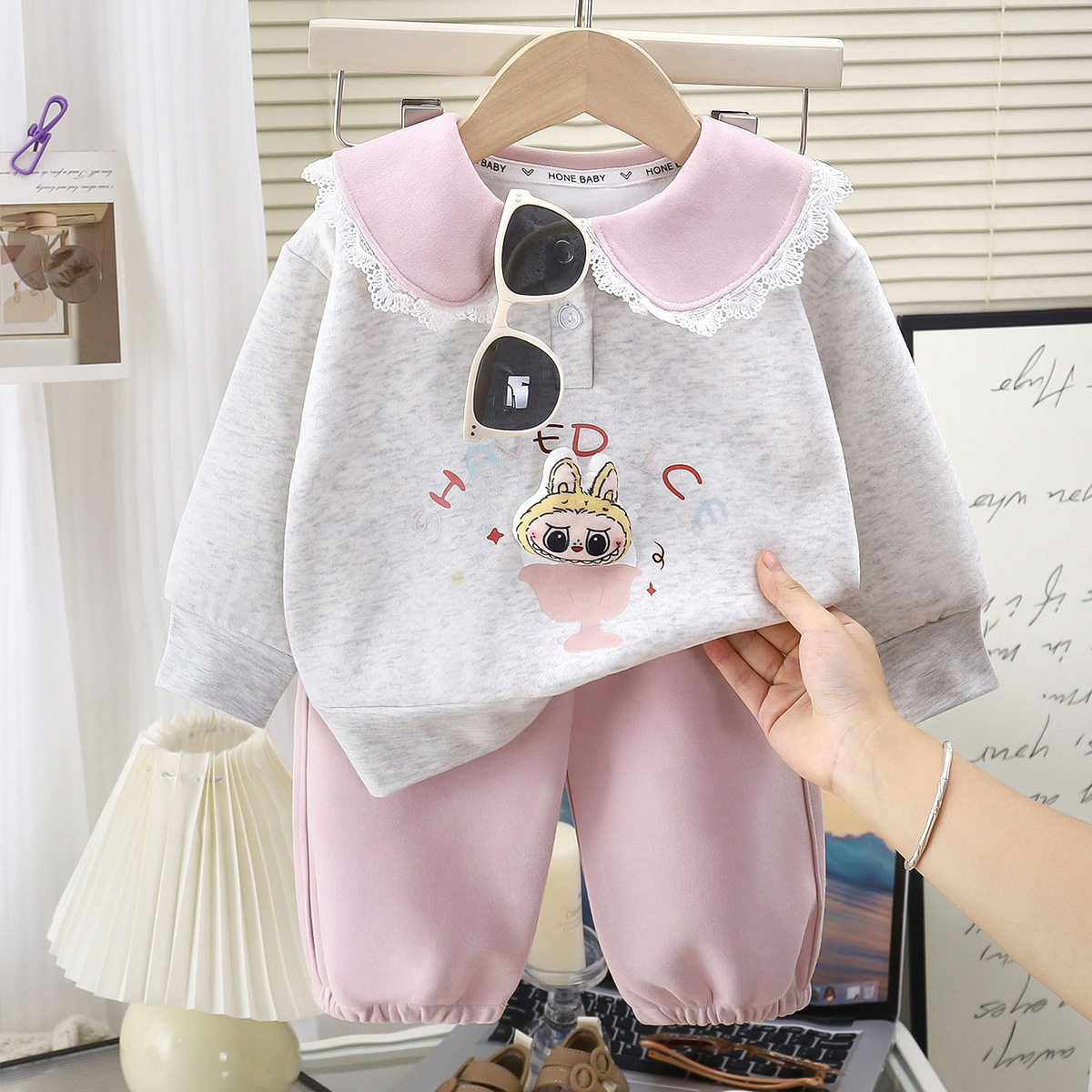 新款 女孩休闲洋气娃领运动两件套 2025春季 女宝宝卡通花边卫衣套装由