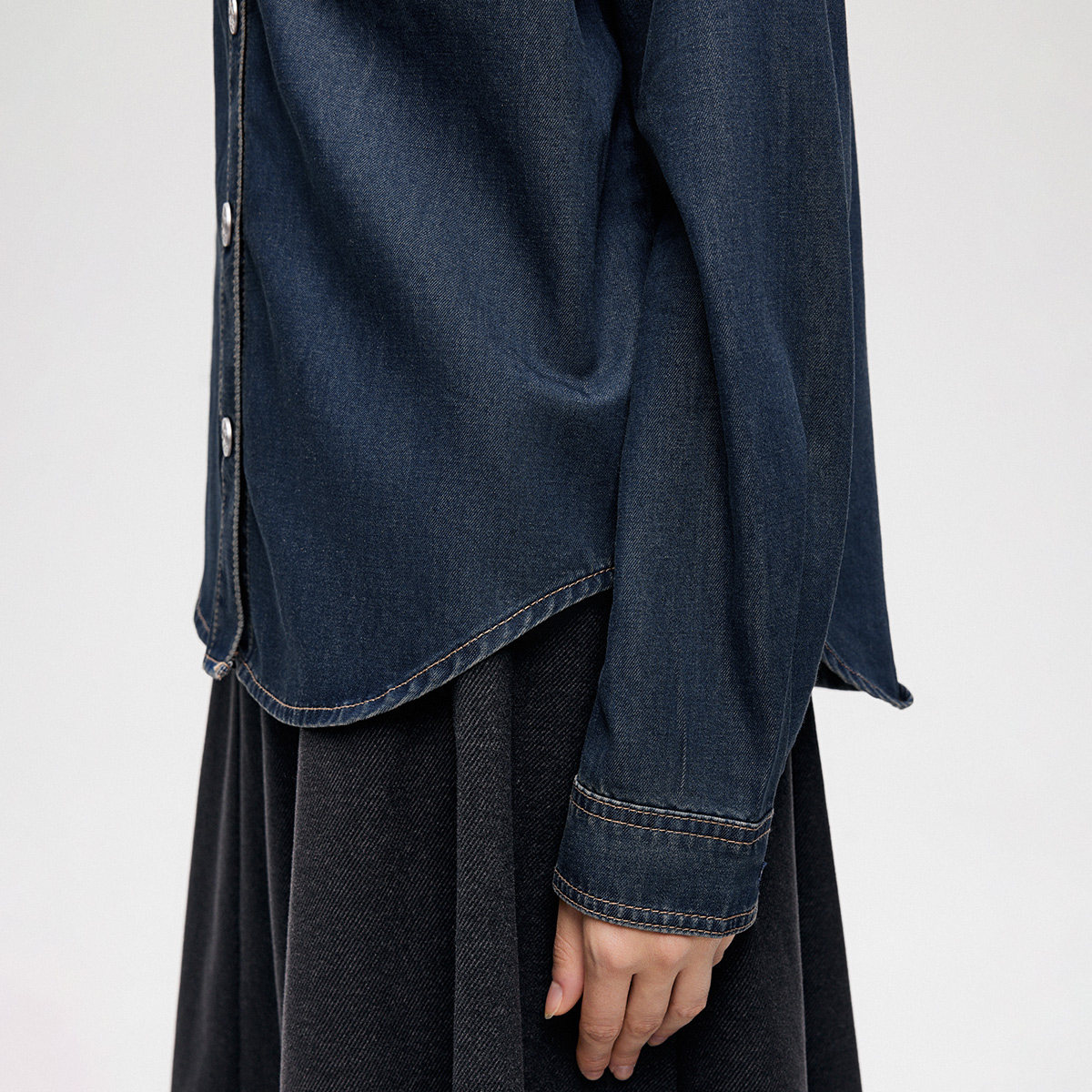 ONLY2026夏季 灵动圆弧形下摆设计正肩长袖 翻领牛仔衬衫 女 新款