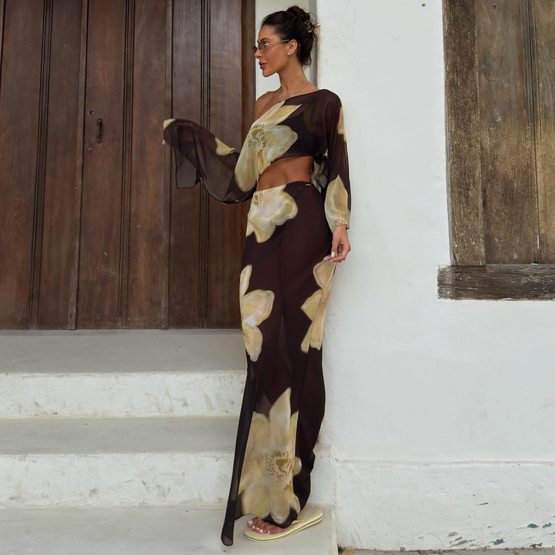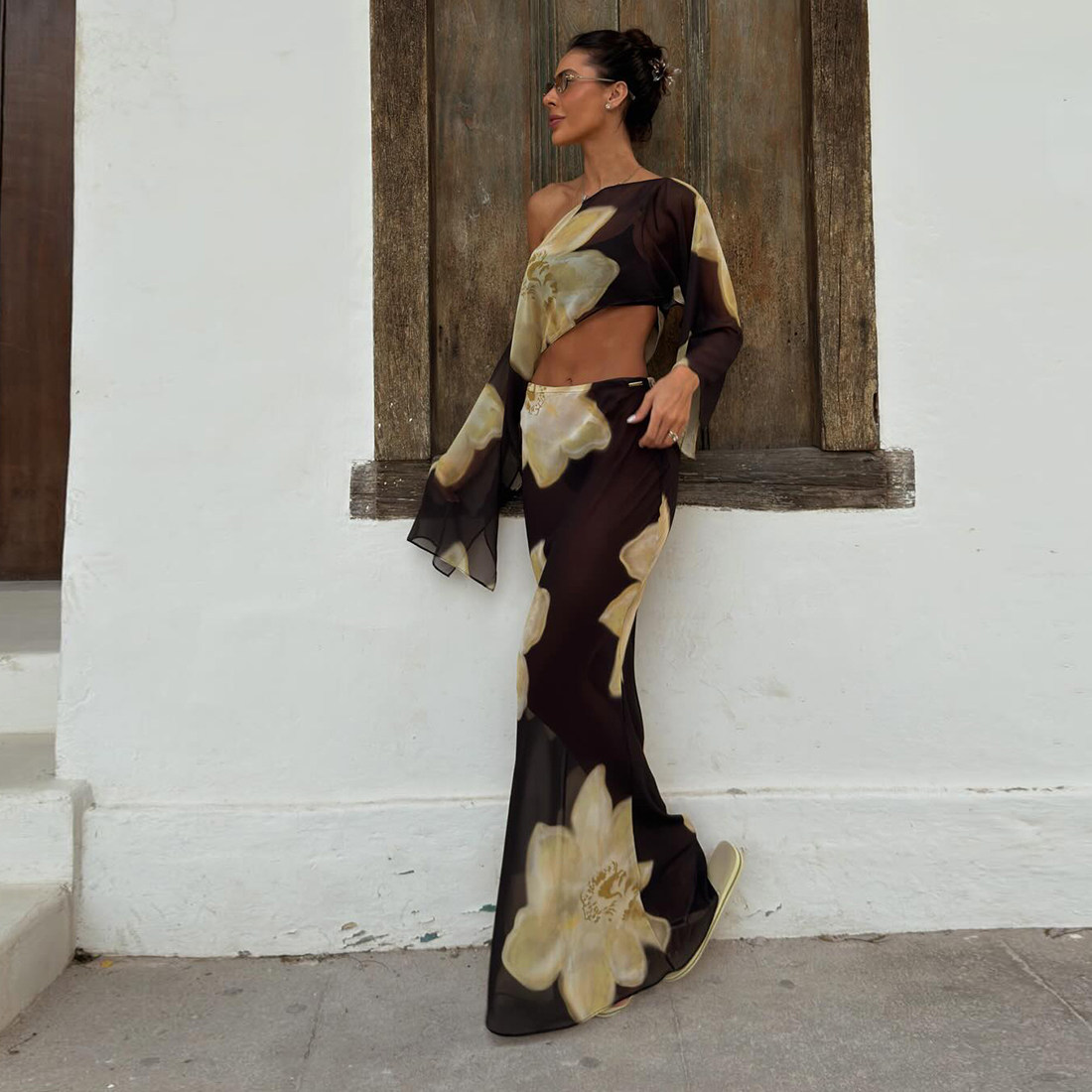 修身 WEIRD PUSS 复古风虞美人花卉印花斜肩上衣女 半身裙辣妹套装