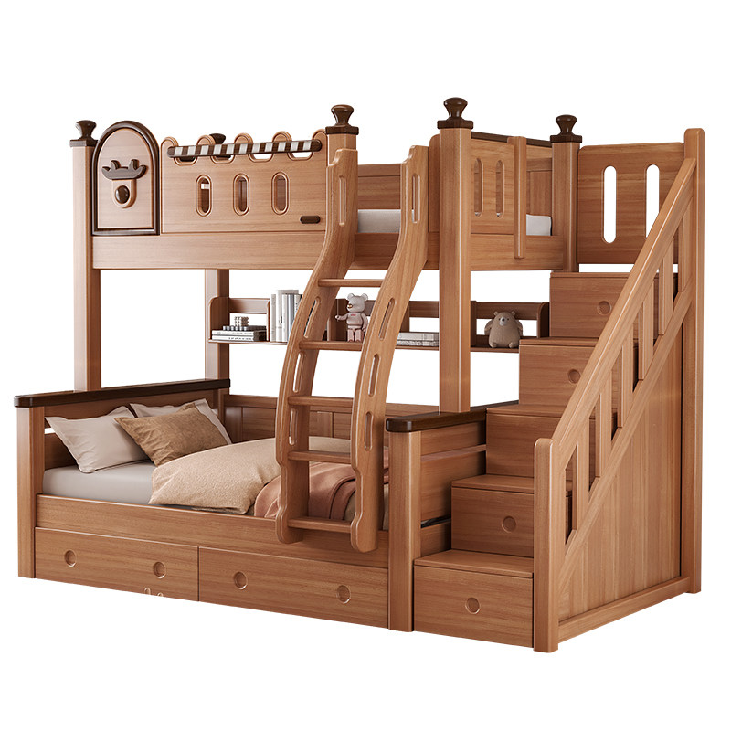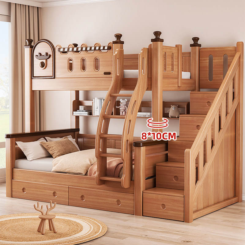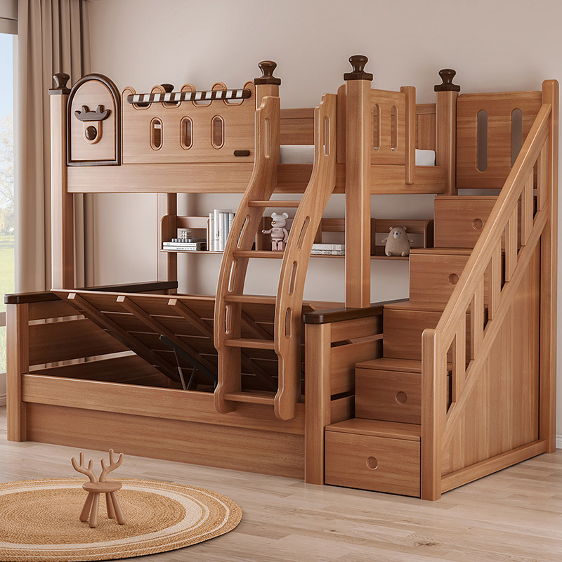 全红檀木上下铺实木儿童高低床小户型中古风母子双层床两层上下床