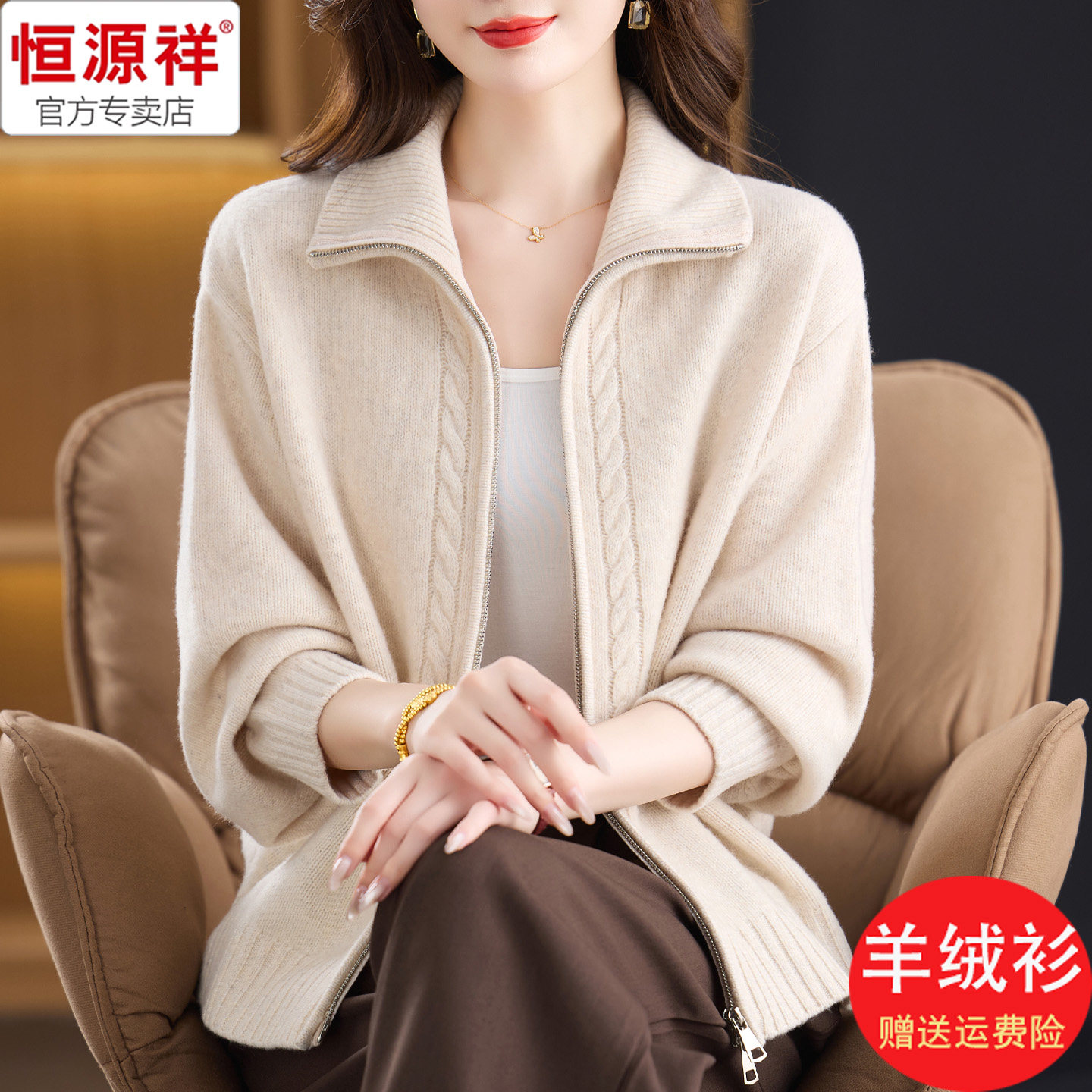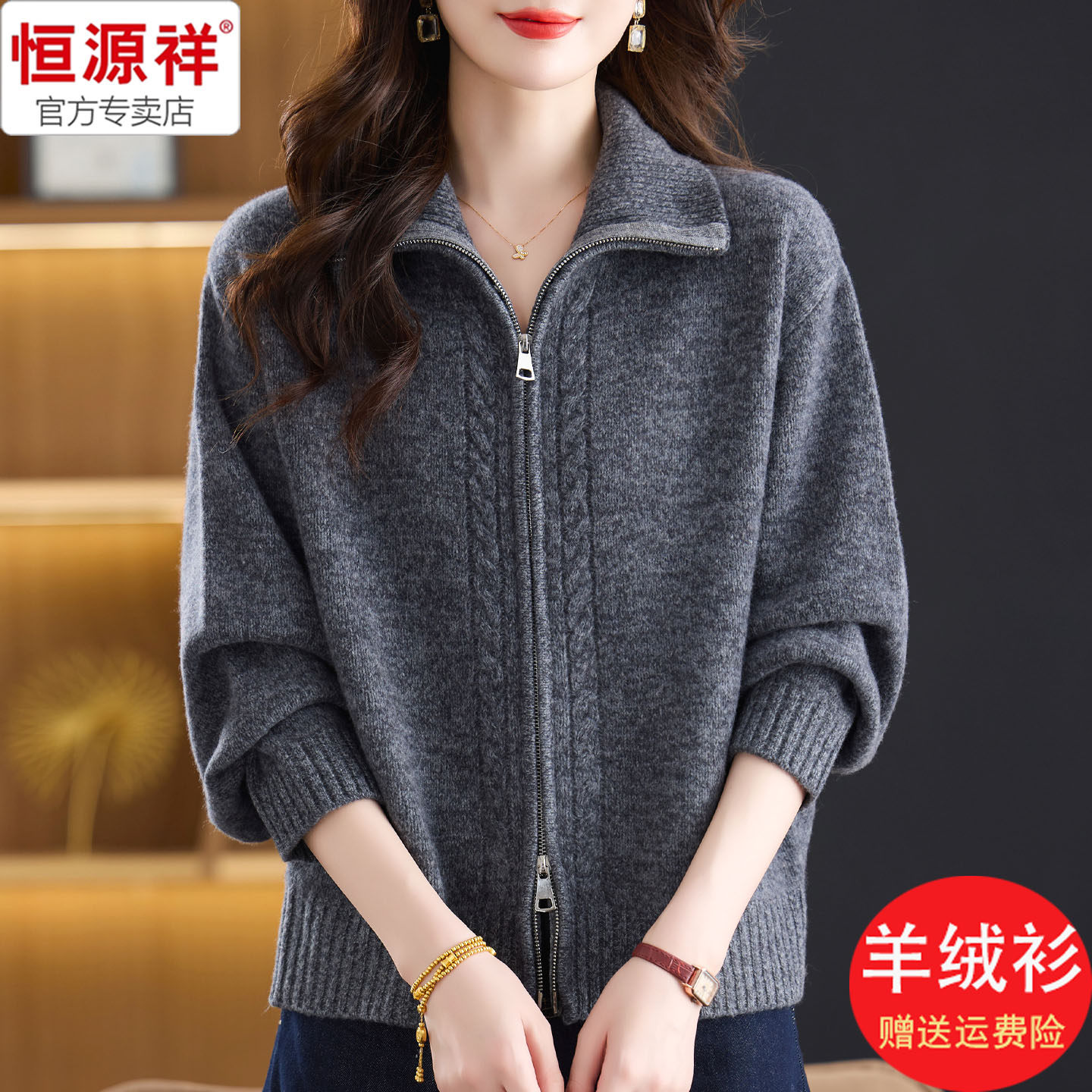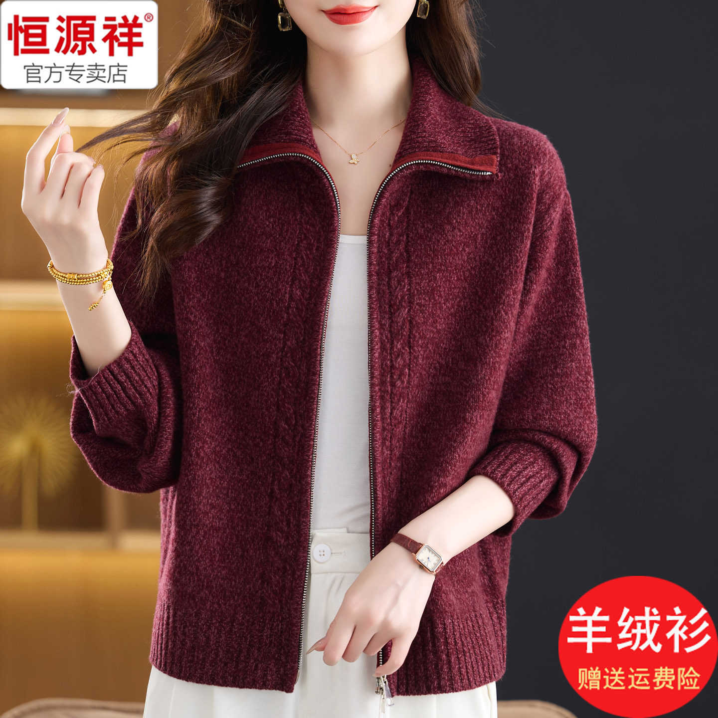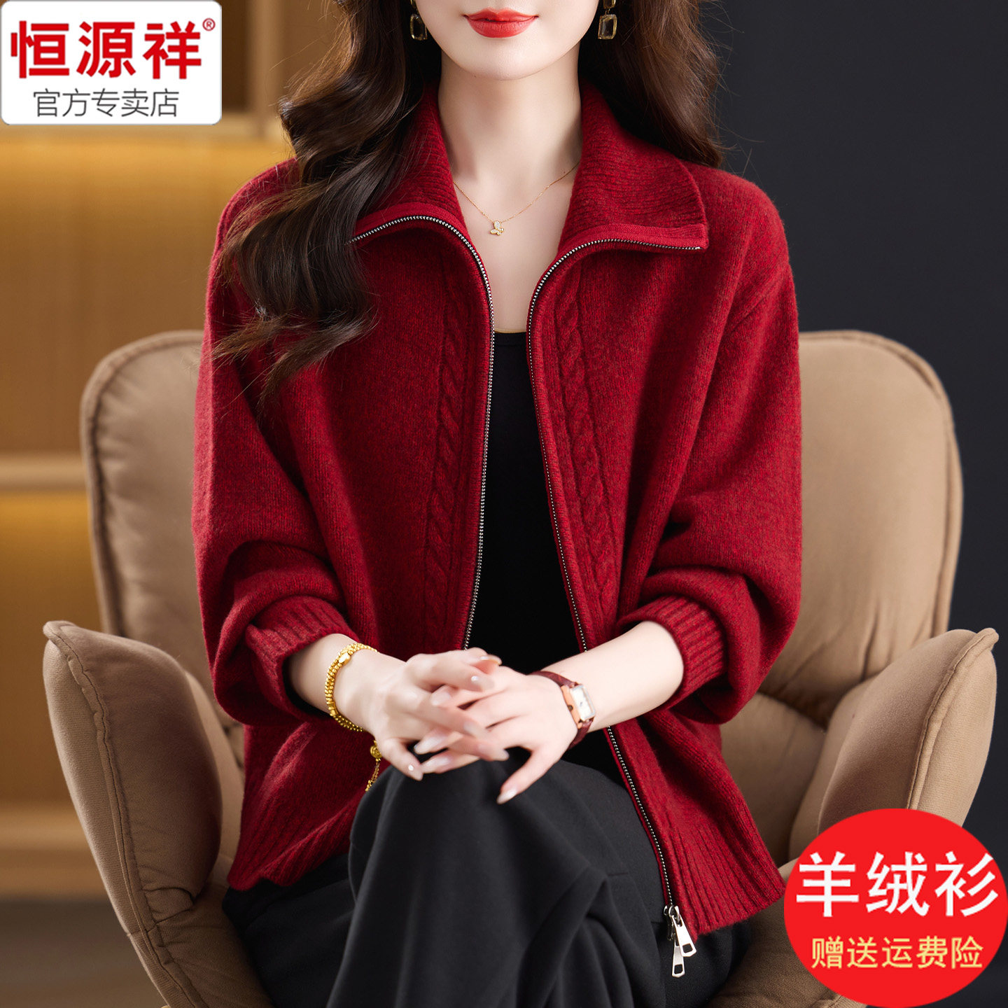 恒源祥复古冬装 女2025新款 加厚保暖双拉链开衫 宽松毛线衣红 羊绒衫