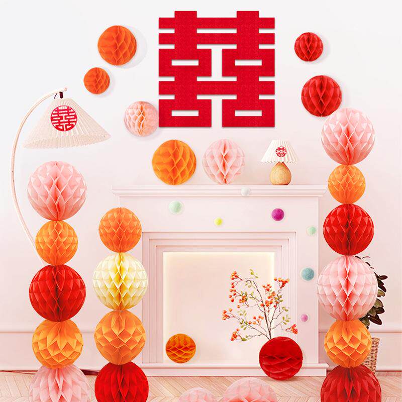 为您提供商品结婚蜂窝球立柱挂饰婚房布置婚礼新房客厅灯笼拉花结婚装 饰套装的详细介绍,