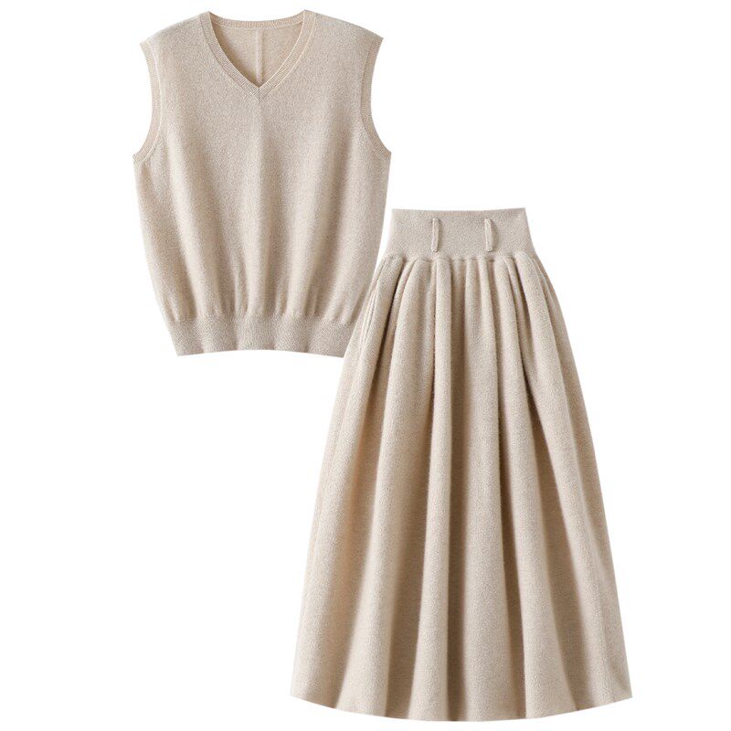 女V领背心马甲半身裙子伞裙套装 加厚100%纯山羊绒衫 气质到骨子里由
