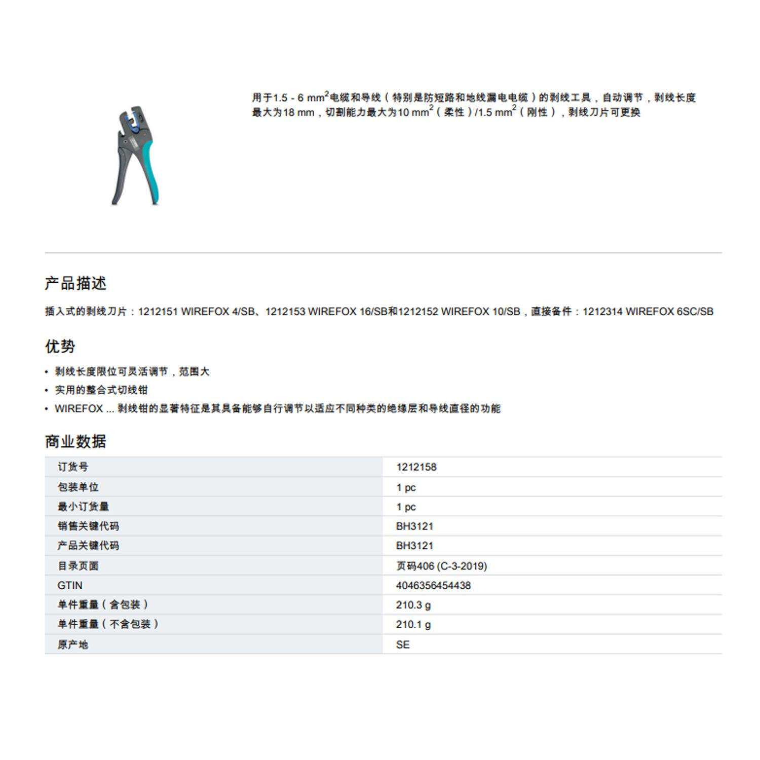 为您提供商品菲尼克斯剥线钳WIREFOX 1212158电缆电工专业工业级多功能 6SC的详细介绍,