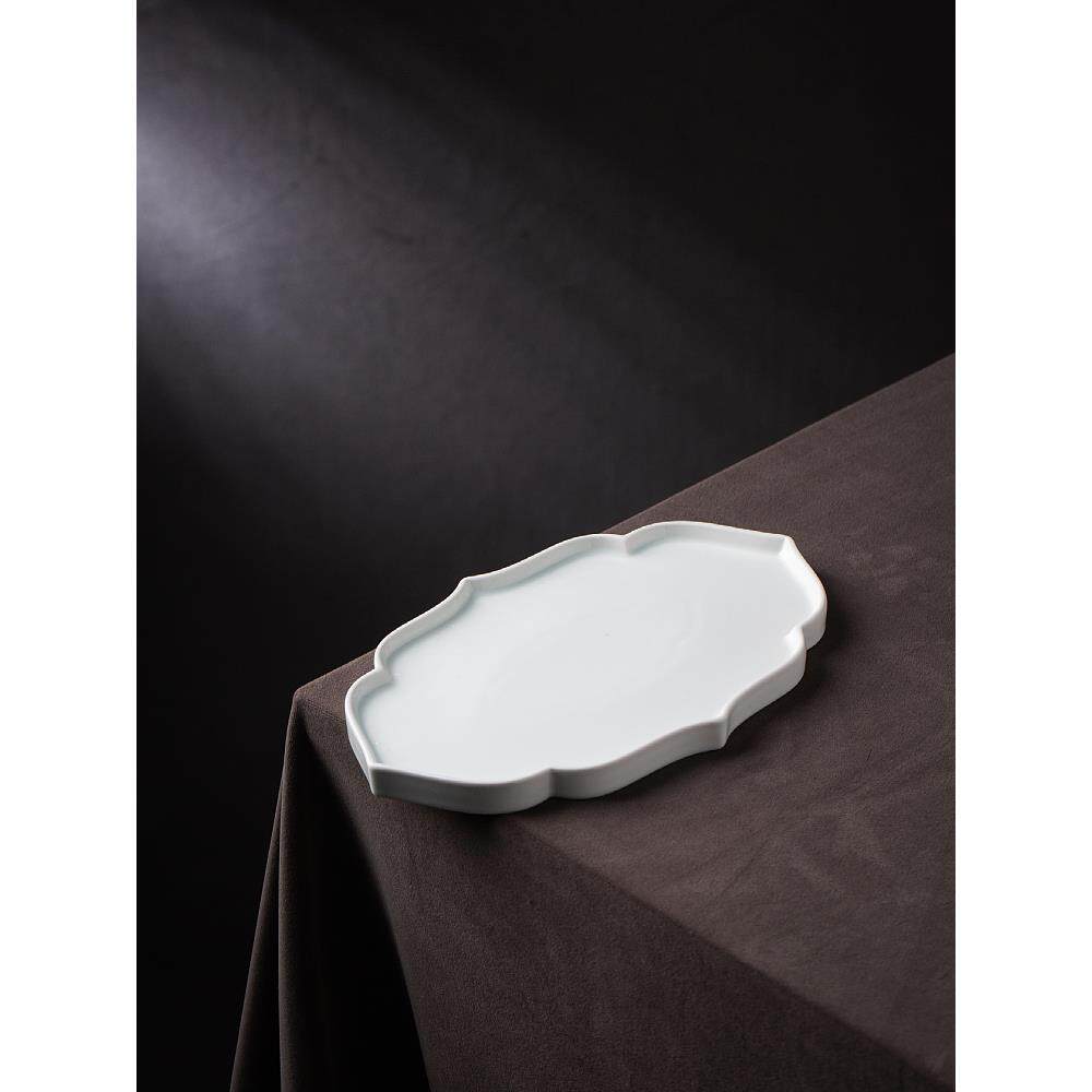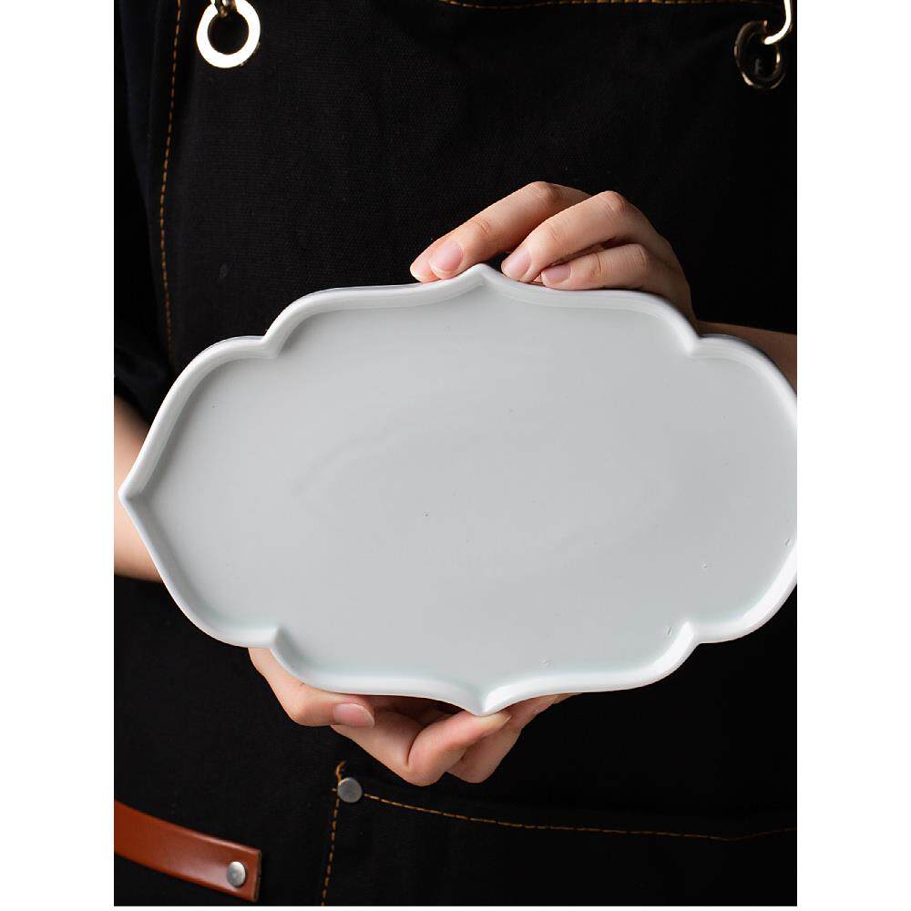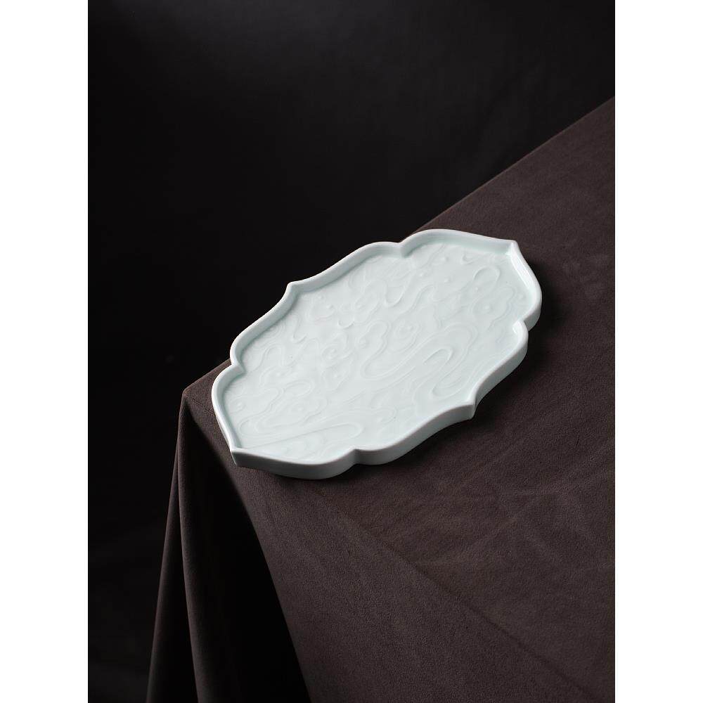 青白色花边手雕祥云陶瓷平茶盘西餐蒸菜盘子饭店酒店餐厅会所餐具由