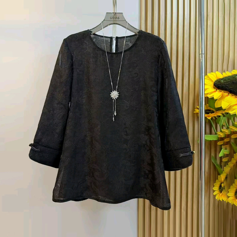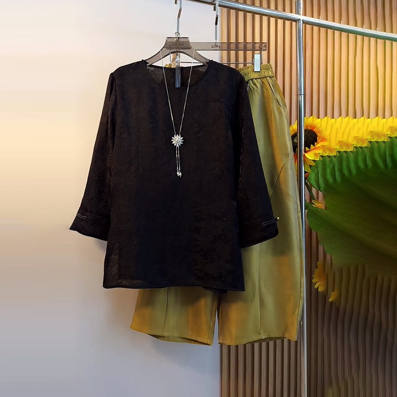 加大码 盘扣袖 口花纹上衣胖妹妹斜压线宽松百搭松紧腰阔腿裤 子 女装由