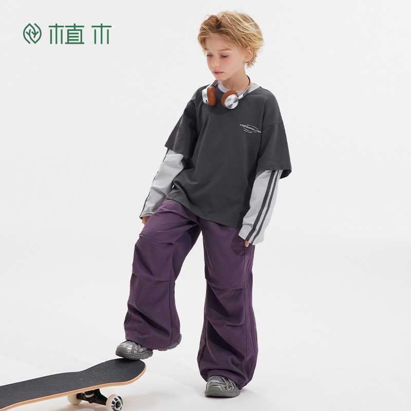 植木儿童T恤2026春新款 中大童假两件复古印花上衣男童T恤童装由