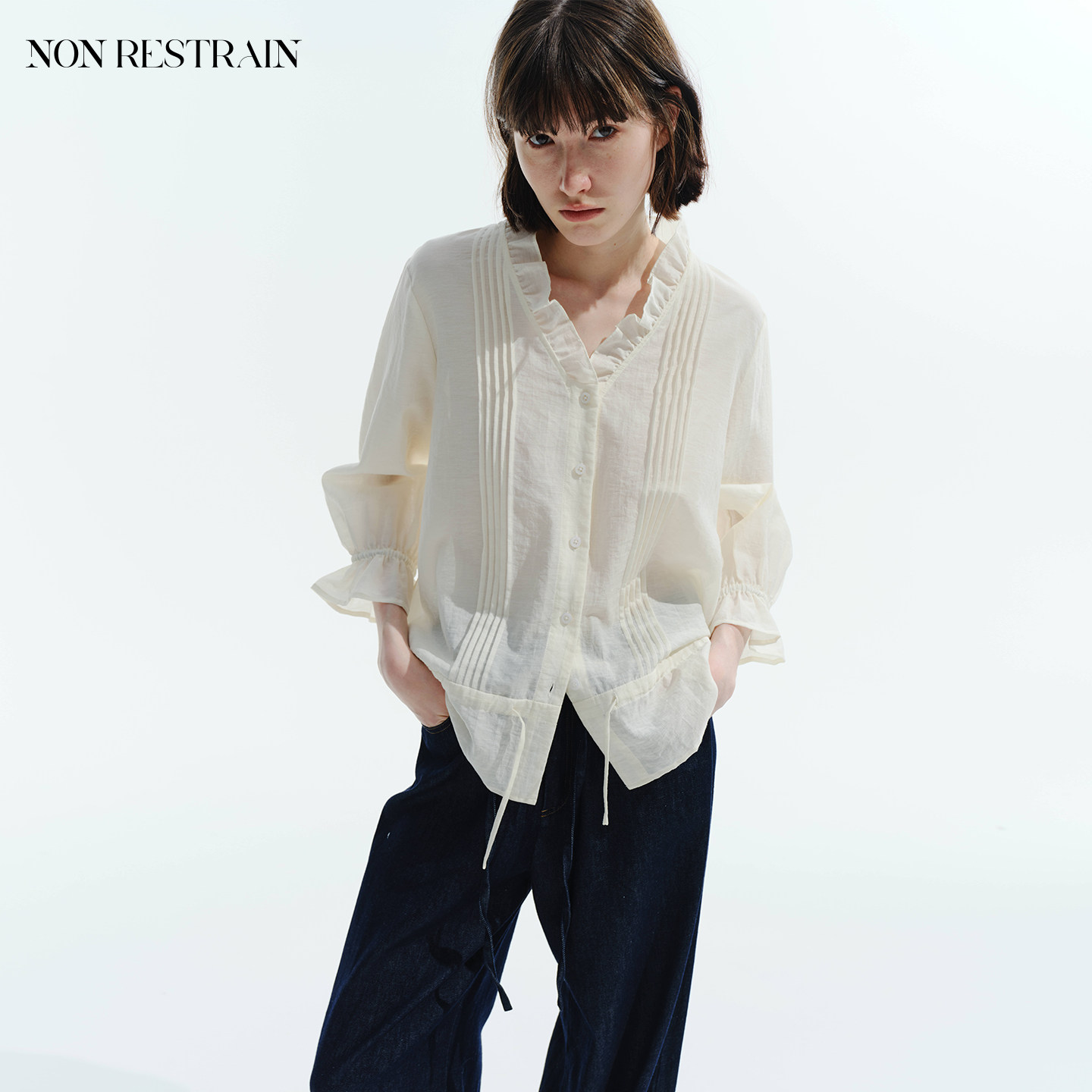 NON 荷叶边V领七分袖 衬衫 女通勤微透塔克褶抽绳衬衣 RESTRAIN法式由