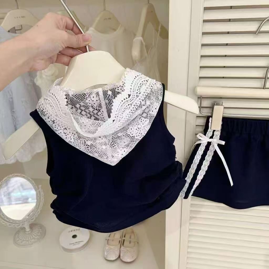 女宝宝洋气蕾丝连帽短袖 女童夏季 套装 2025新款 两件套 半身裙无袖
