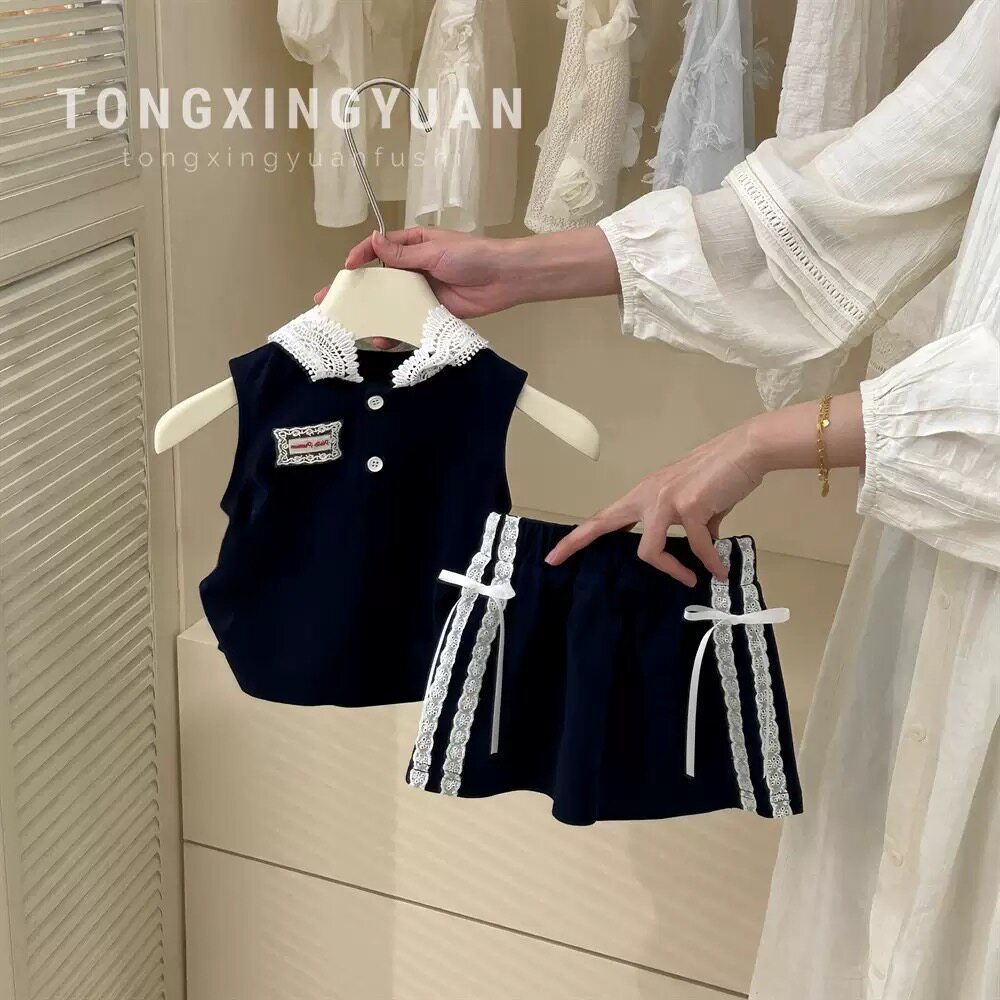 女宝宝洋气蕾丝连帽短袖 女童夏季 套装 2025新款 两件套 半身裙无袖由