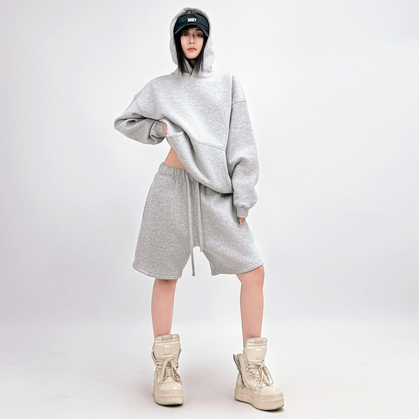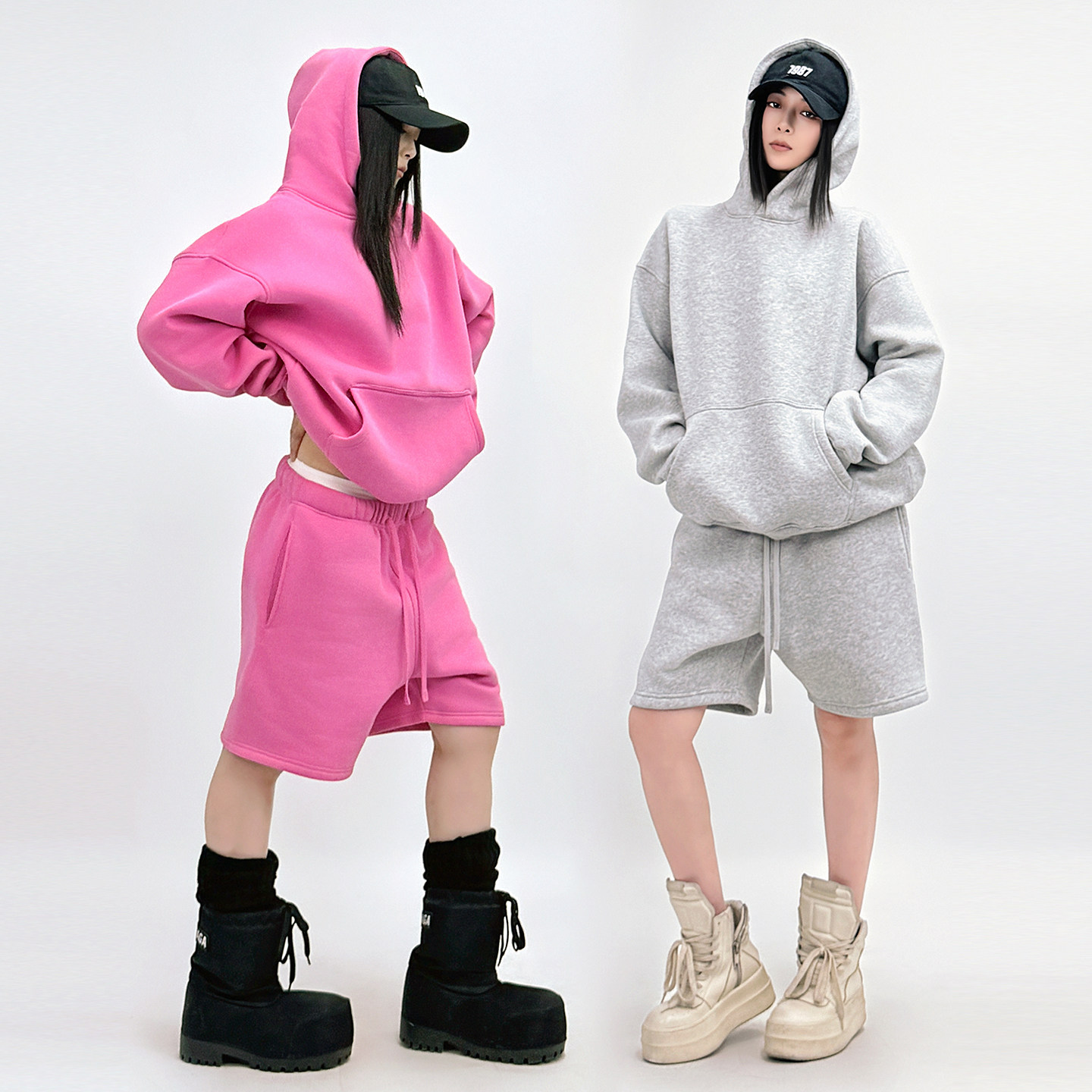 SUN90 复古辣妹风连帽卫衣五分裤 套装 女宽松慵懒粉色两件套 美式由