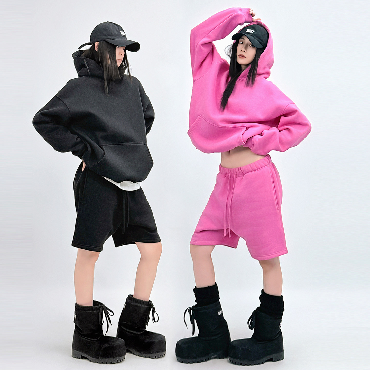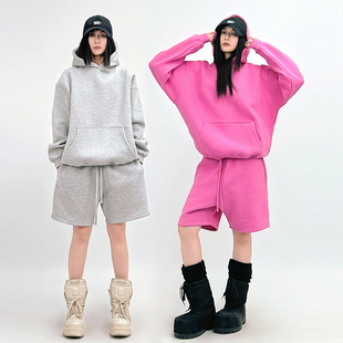 SUN90 复古辣妹风连帽卫衣五分裤 套装 女宽松慵懒粉色两件套 美式