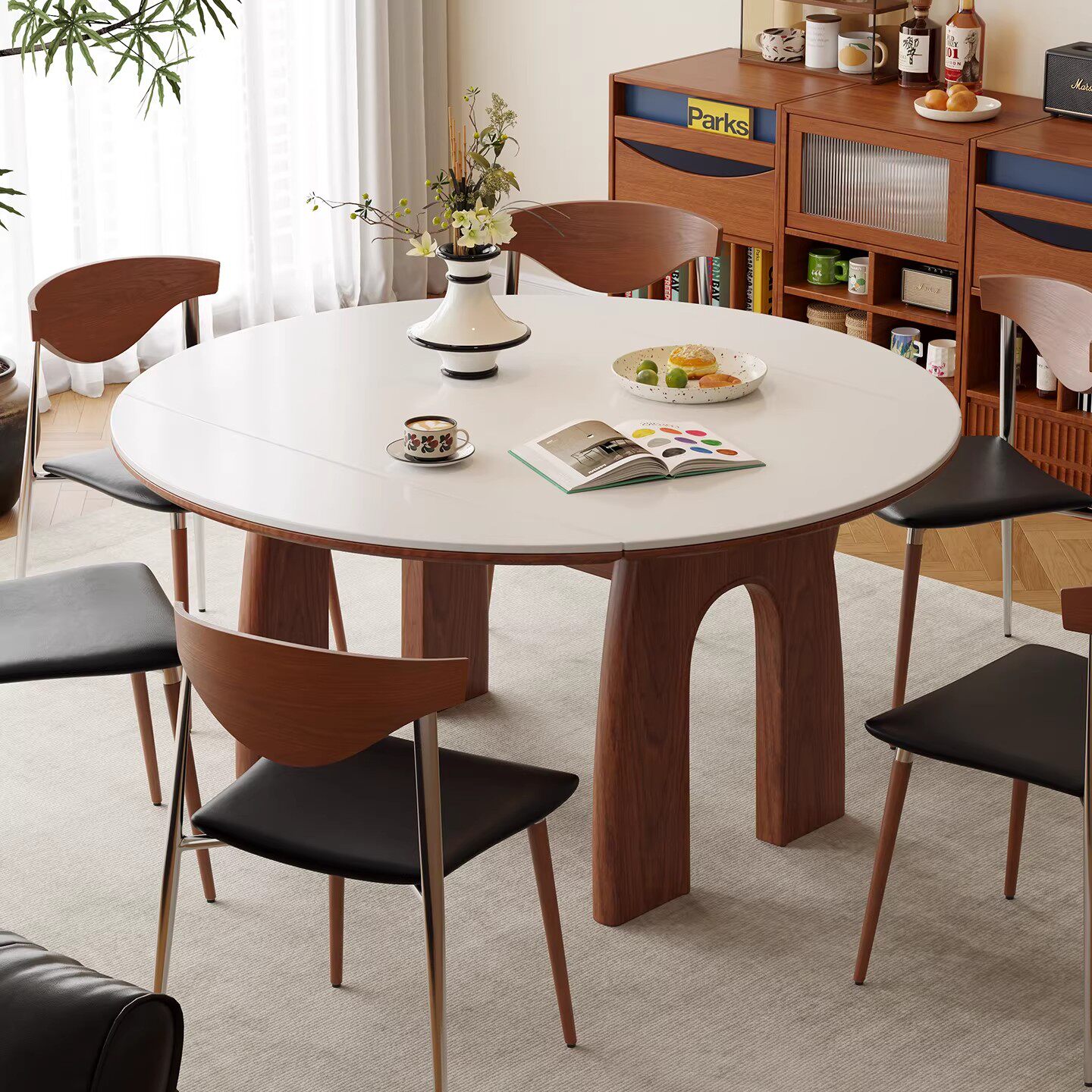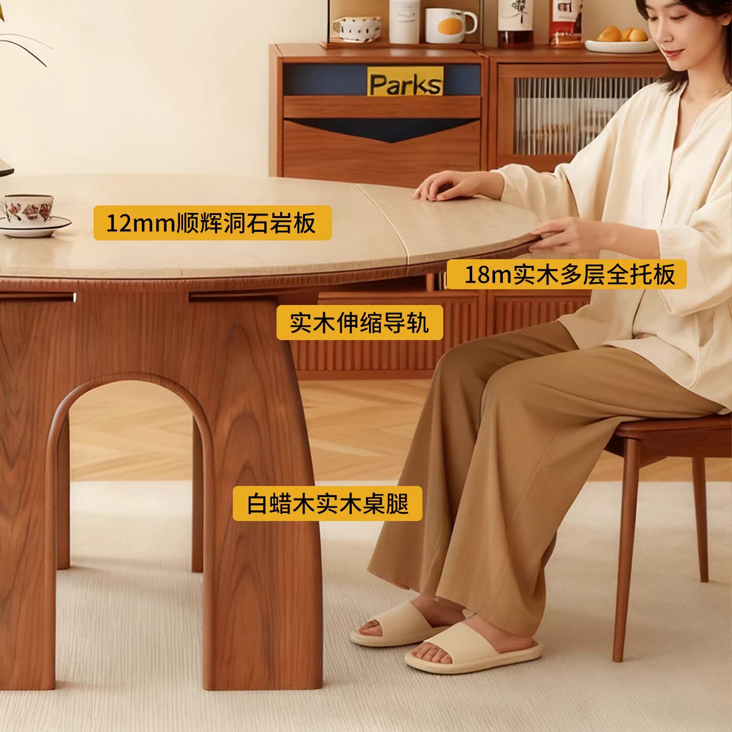 为您提供商品白蜡木全实木洞石岩板餐桌可变折叠小户型中古风家用伸缩折叠圆桌的详细介绍,
