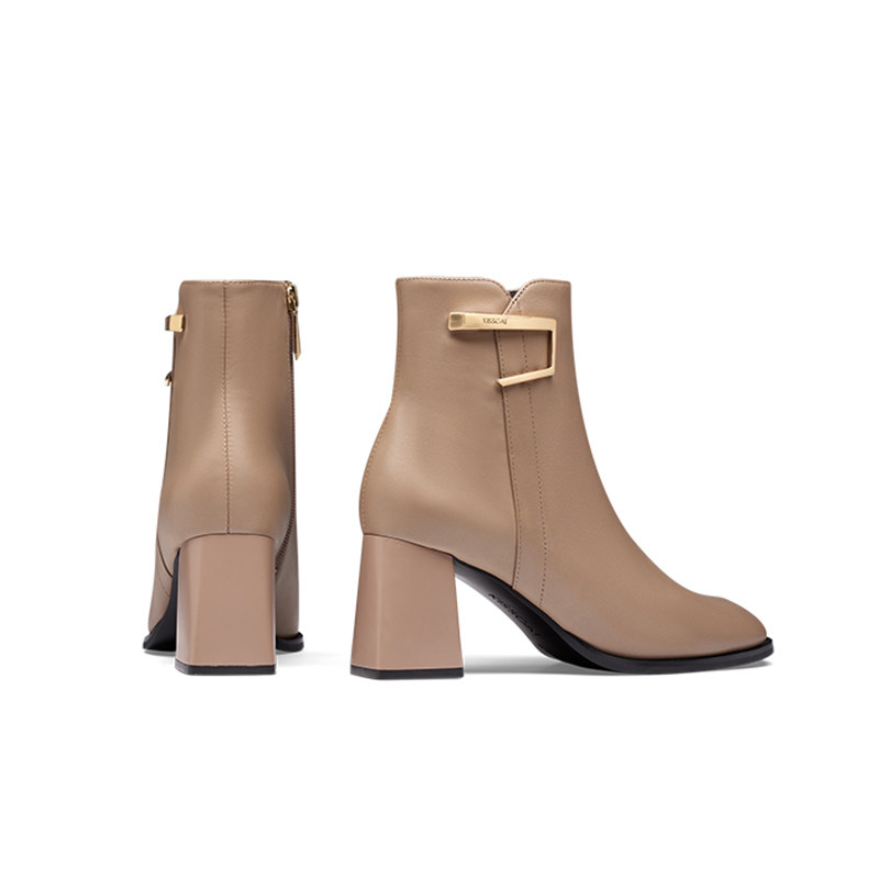 百丽超软羊皮显瘦女靴粗高跟时装 加绒短筒靴子3LI44DD5 靴冬新款
