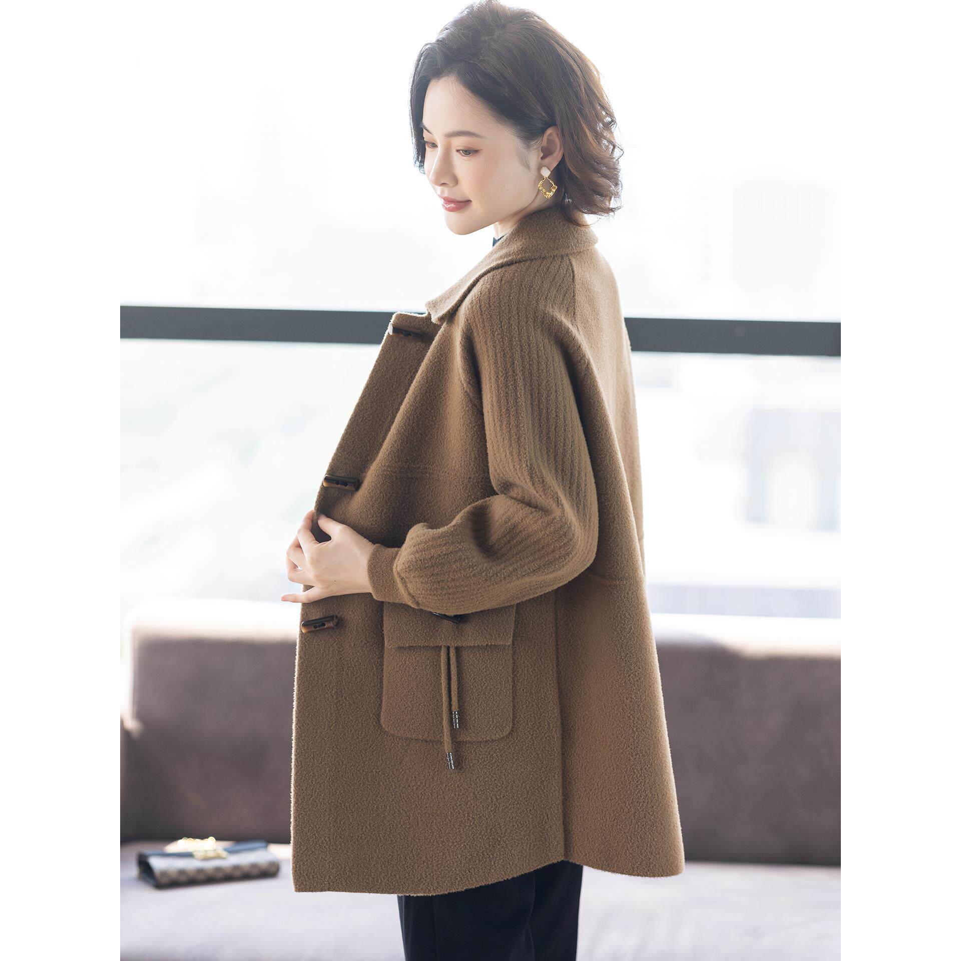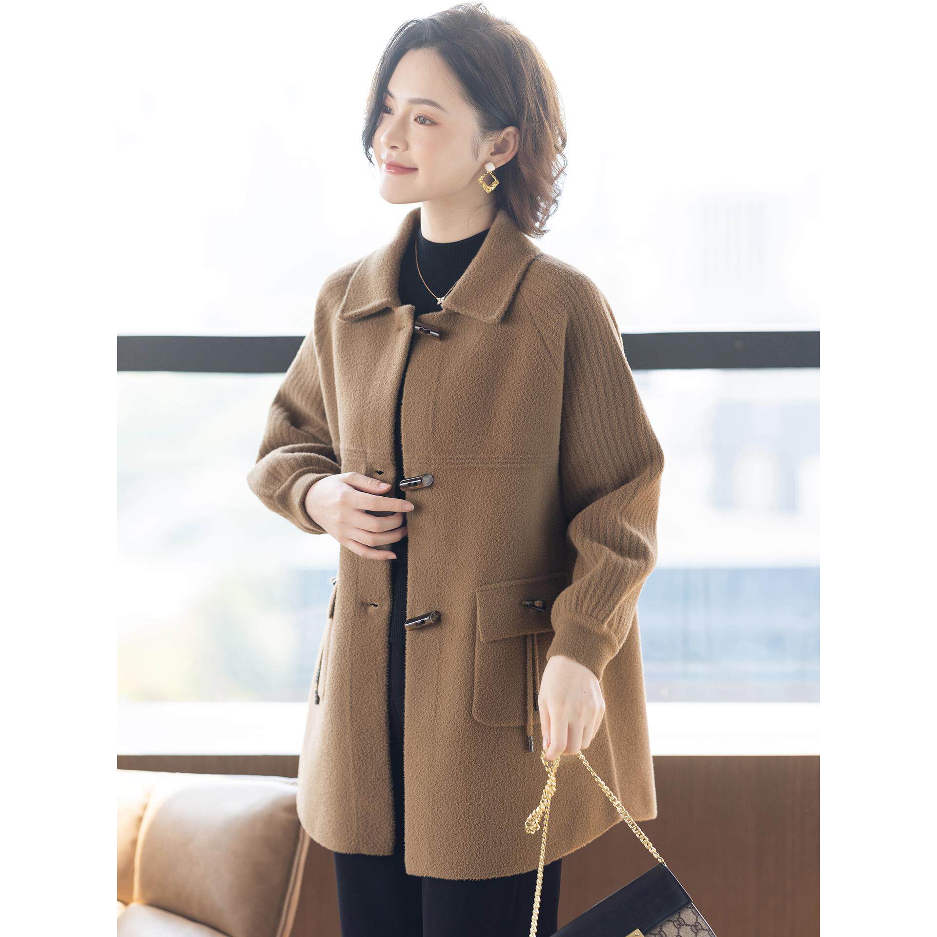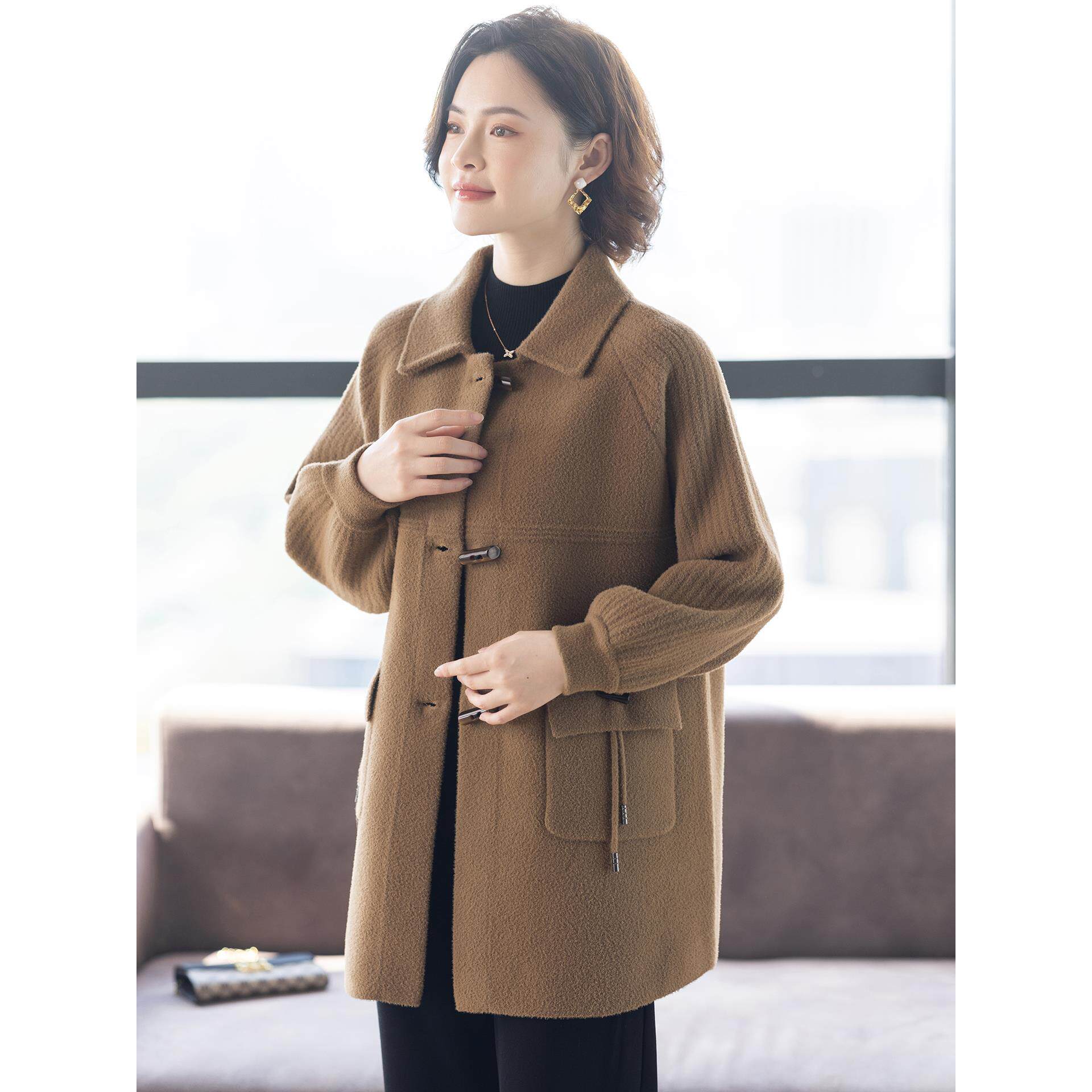 大衣中老年女装 秋冬毛呢上衣 双面呢外套春秋洋气短款 中年妈妈春装