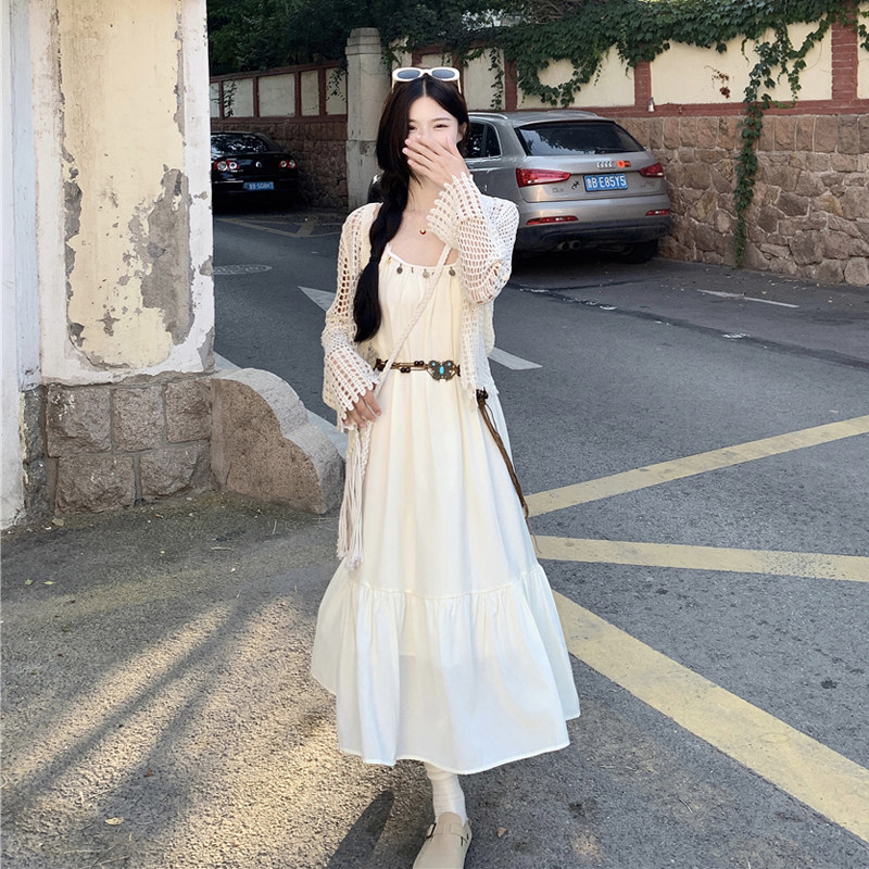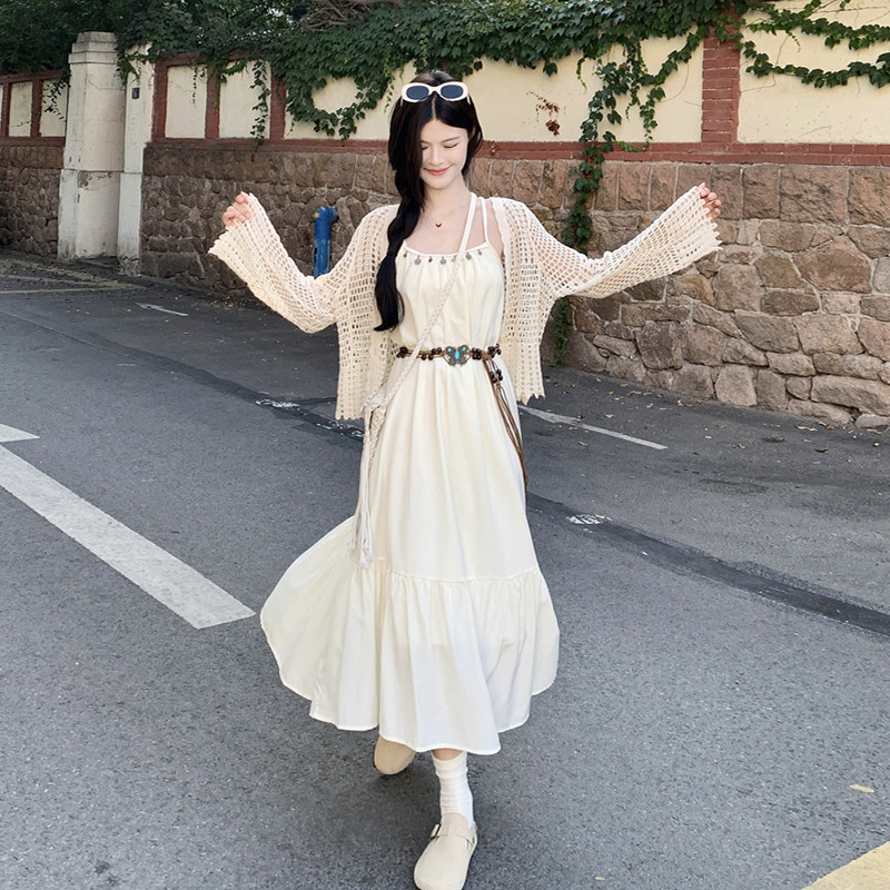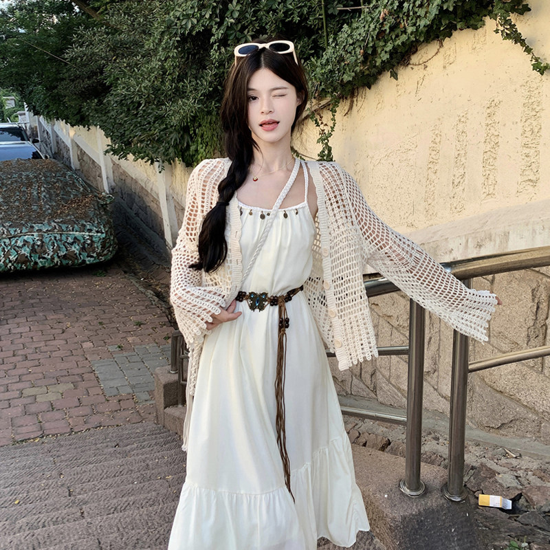 波西米亚吊带连衣裙子两件套装 镂空开衫 云南大理旅游度假穿搭女装