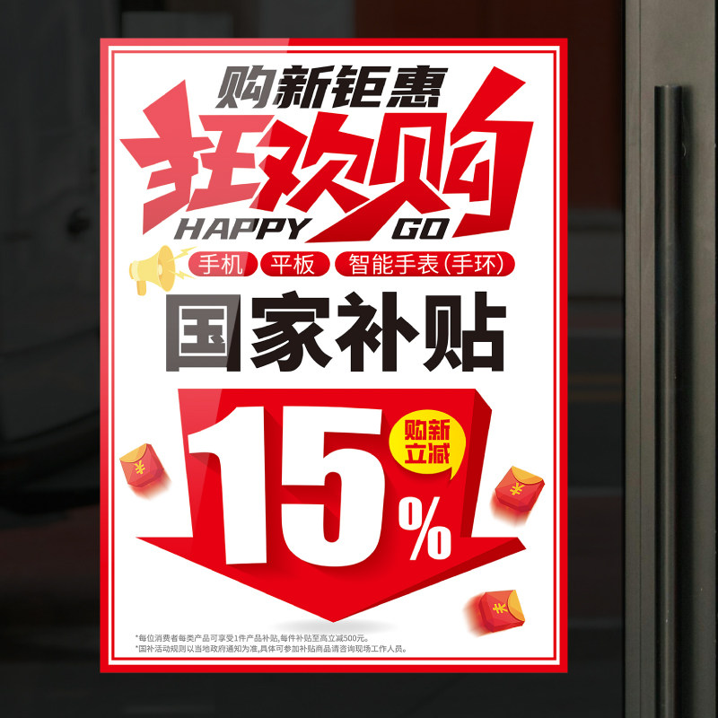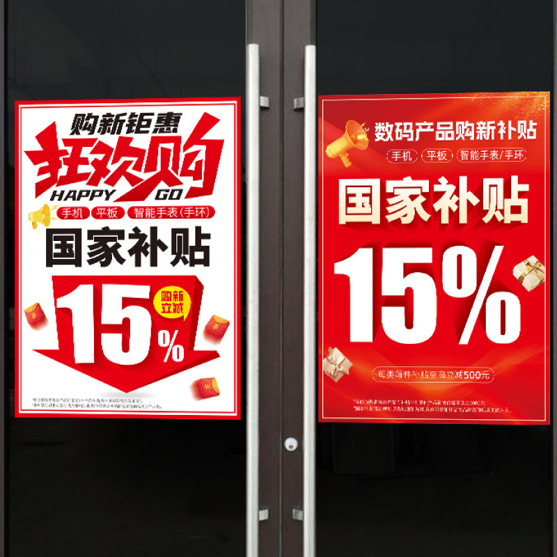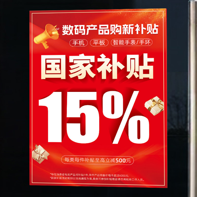 为您提供商品饰贴纸 2026手机店国补3C购新国家补贴15%广告宣传海报玻璃门墙装的详细介绍,
