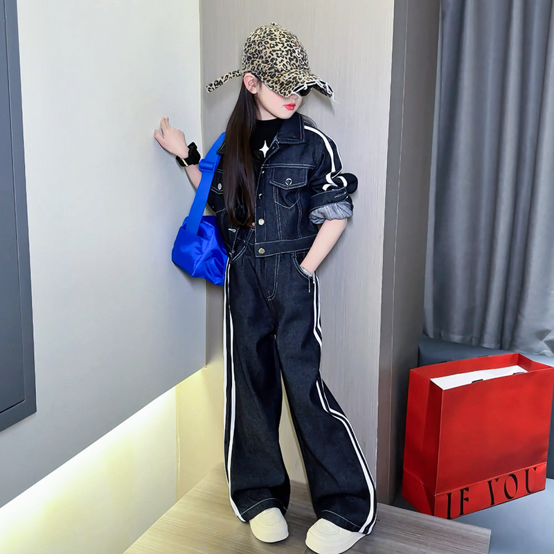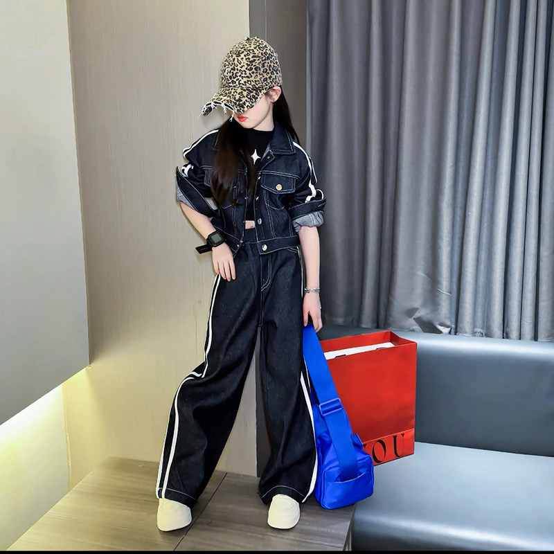 学院风洋气阔腿裤 两件套 韩系牛仔外套潮酷新款 女童2025春秋套装