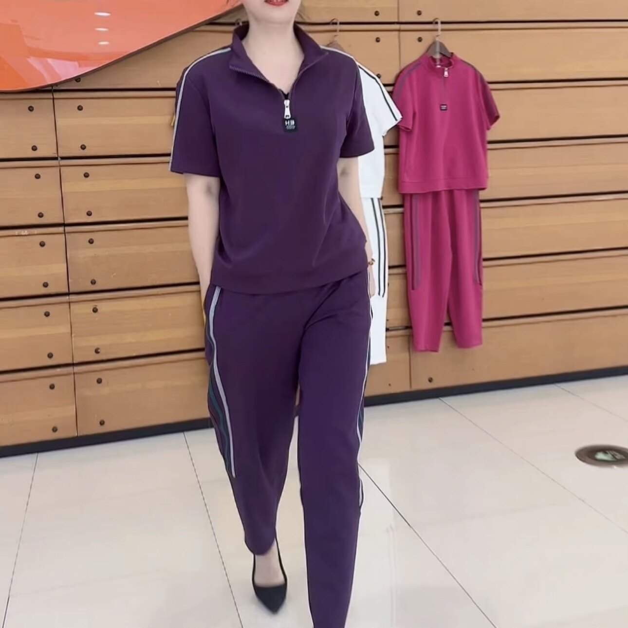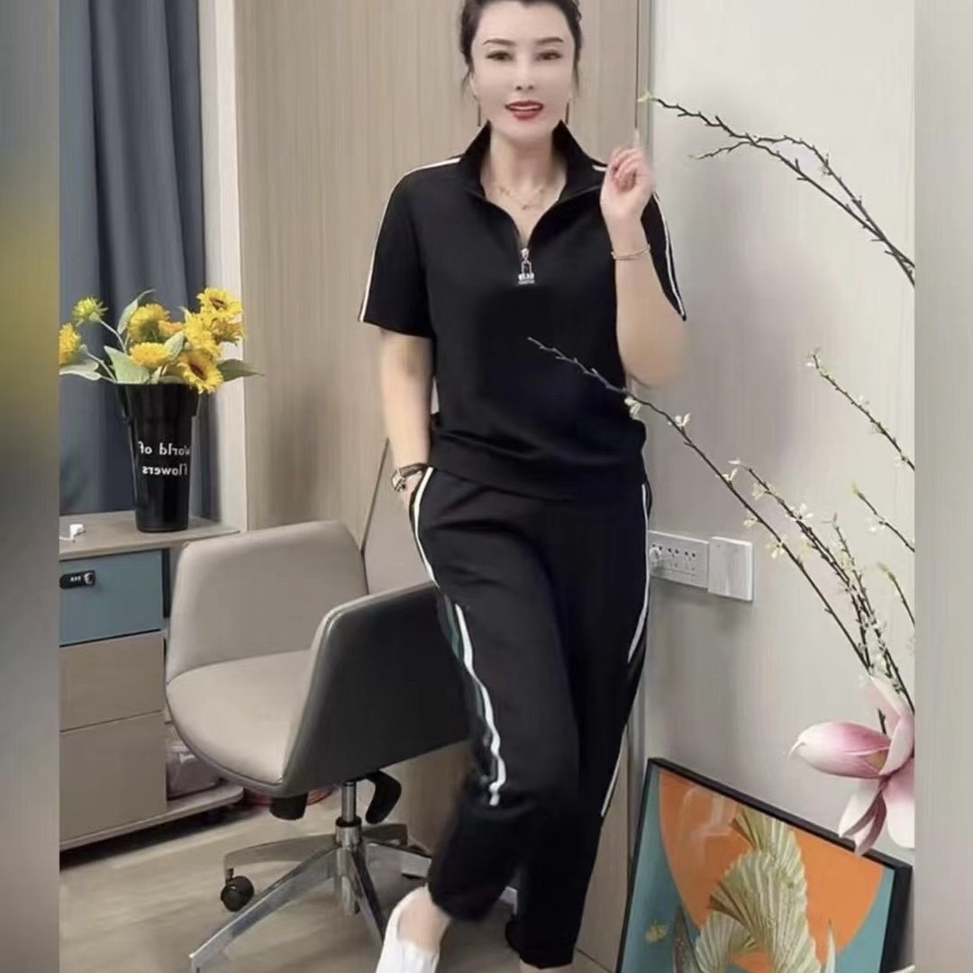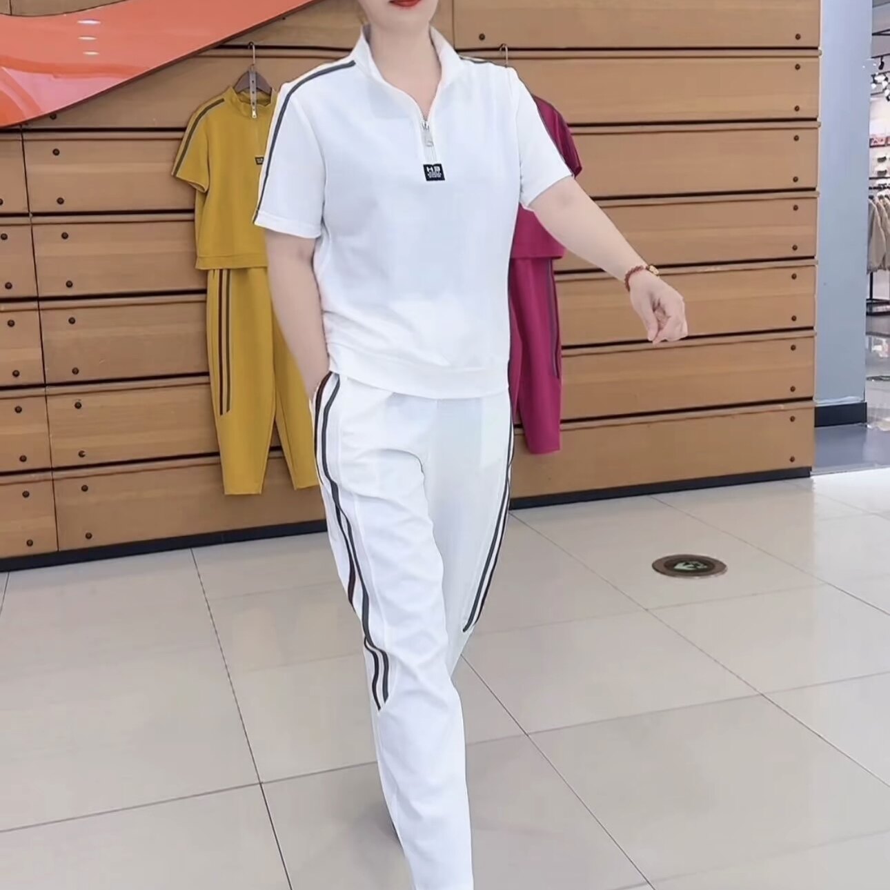 宽松遮肉运动套装 时尚 新款 两件套夏季 拼接半拉链立领短袖 上衣长裤