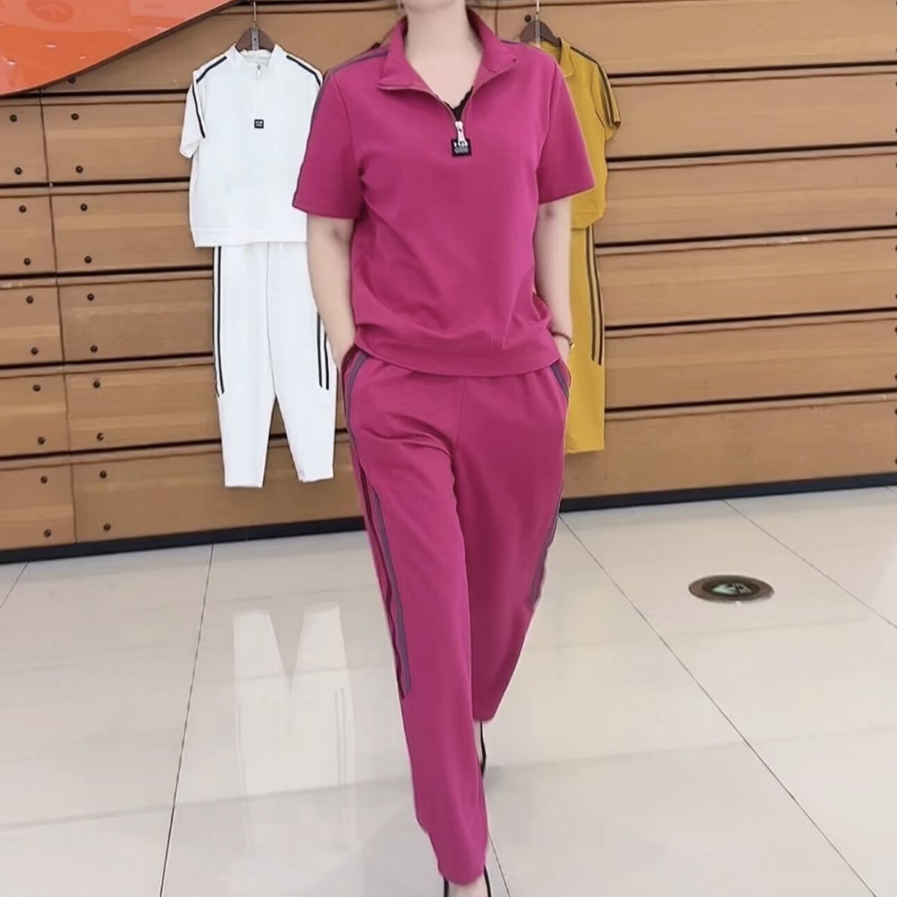 宽松遮肉运动套装 时尚 新款 两件套夏季 拼接半拉链立领短袖 上衣长裤由