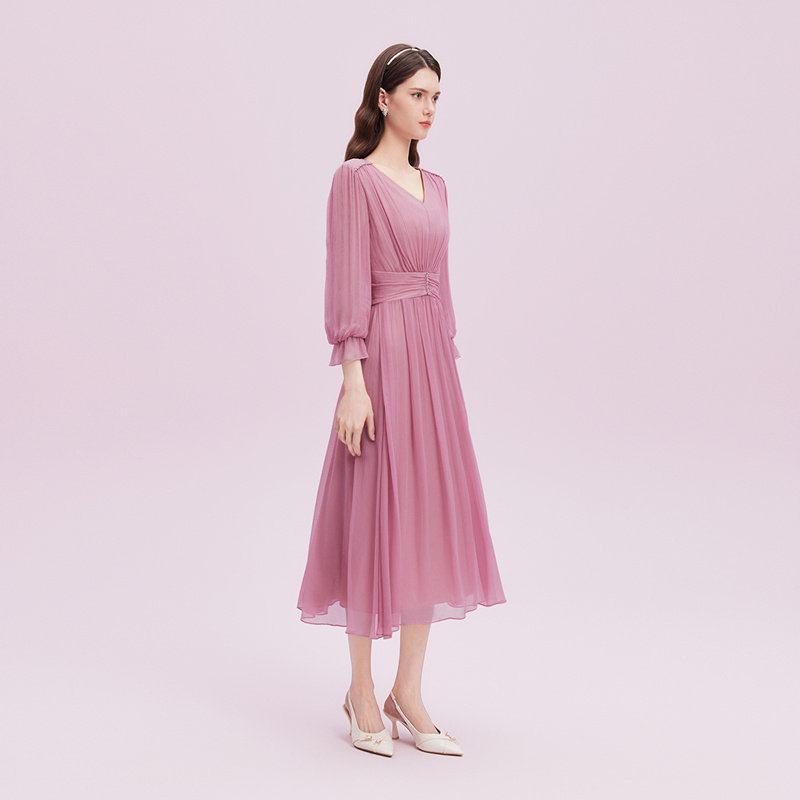 新款 100桑蚕丝v领灯笼袖 连衣裙女 Koradior拉珂蒂2025商场同款由
