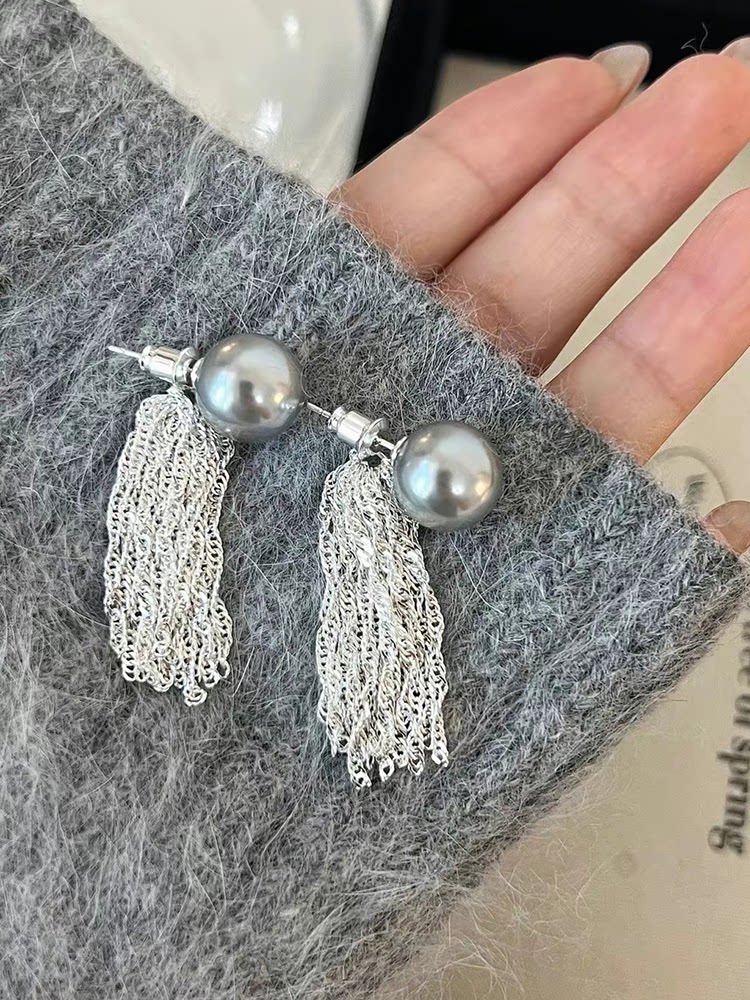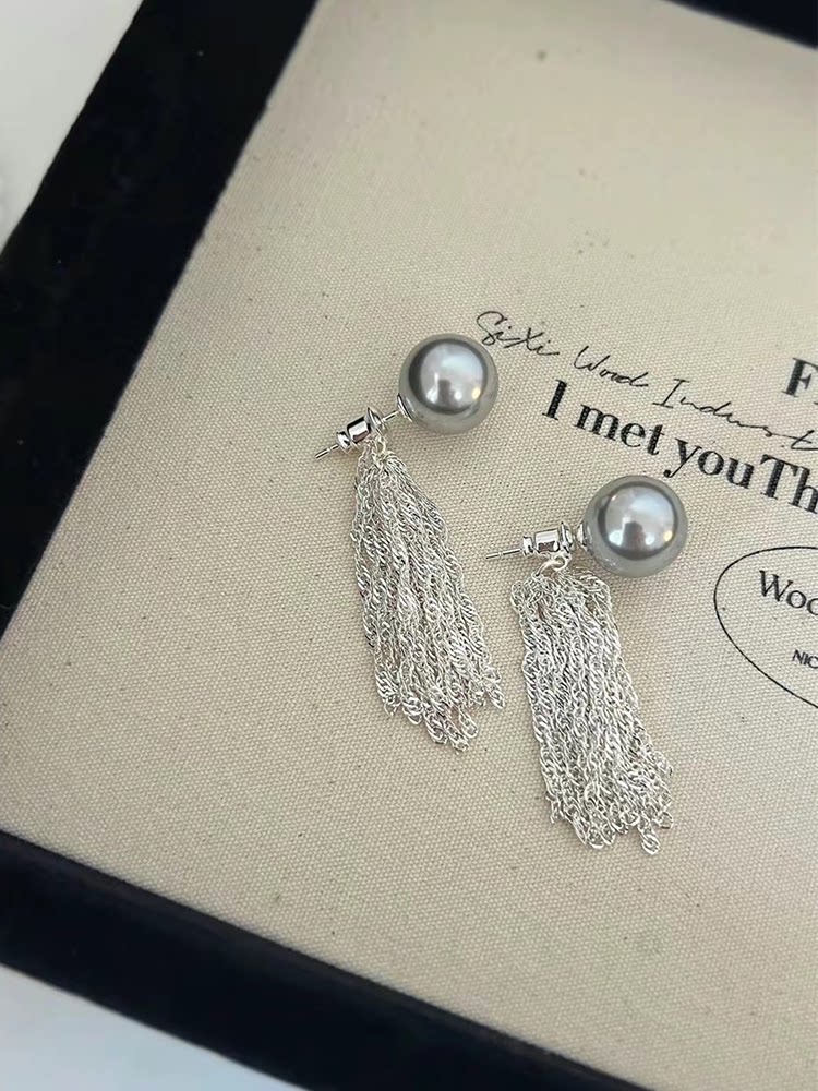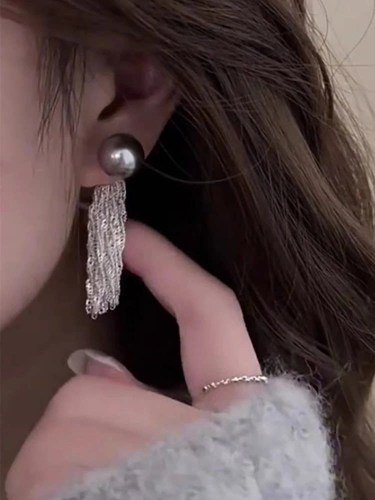 极简风时髦轻奢一款 独特耳饰 两戴烟灰色珍珠链条流苏耳钉高级个性
