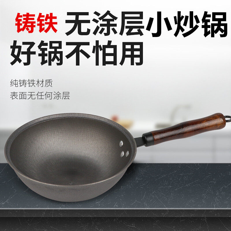 铸铁小炒锅榉木手柄炒锅无涂层宝宝辅食铁锅生铁锅炒菜锅由
