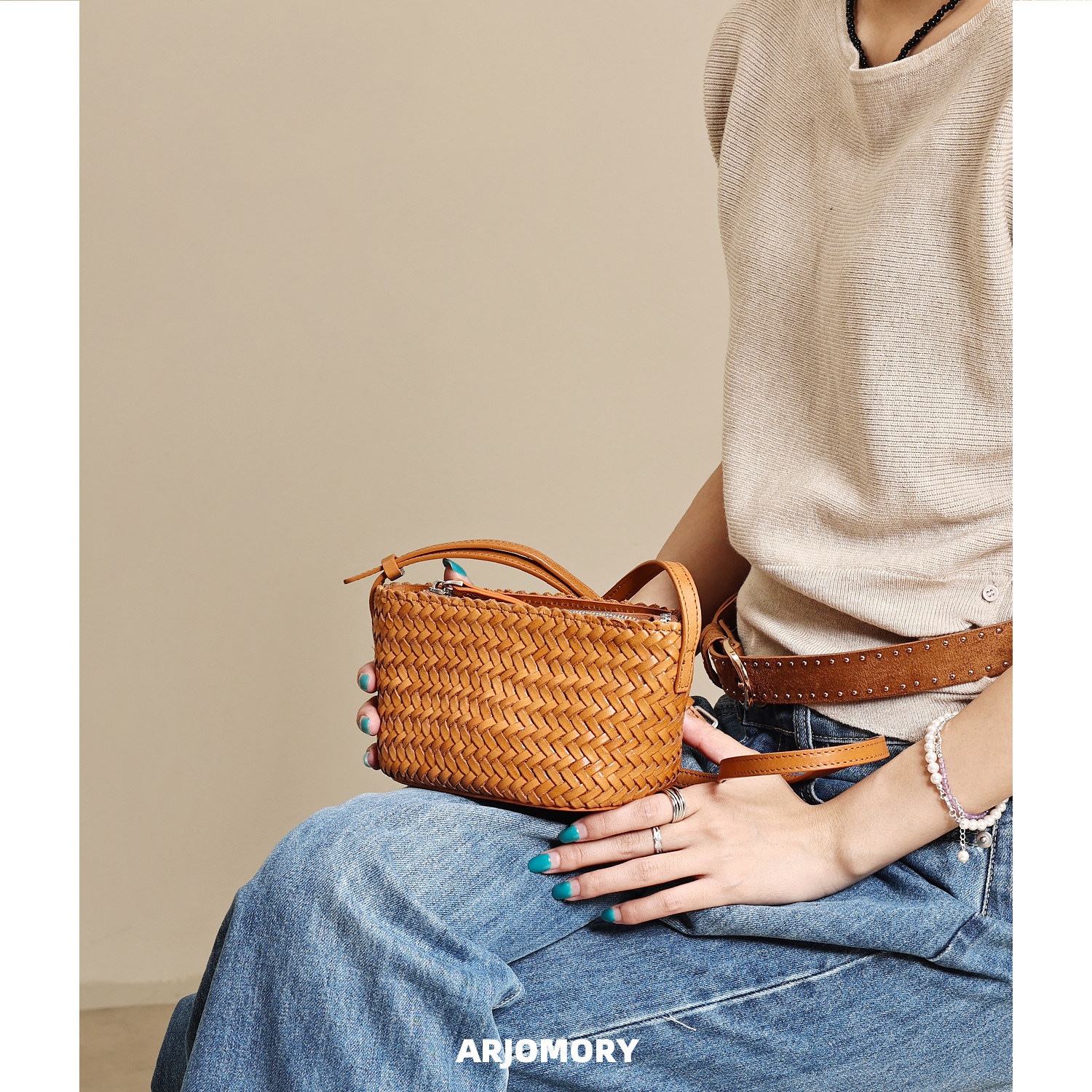 ARJOMORY原创设计高级感头层牛皮手工编织菜篮子包女2026斜挎小包