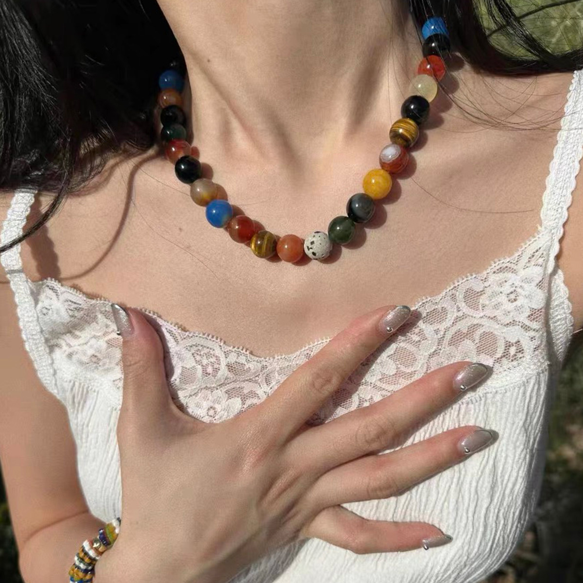 明星同款 小众设计冰透 七彩色玛瑙串珠锁骨链多巴胺圆珠项链女个性
