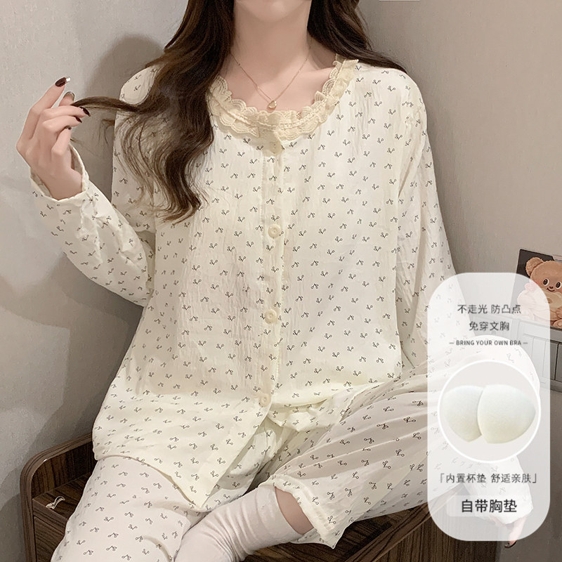 可外穿公主风家居服冬天套装 圆点可爱纯棉长袖 睡衣女带胸垫春秋款
