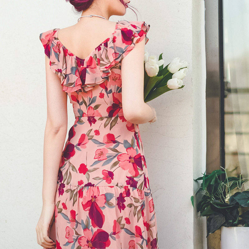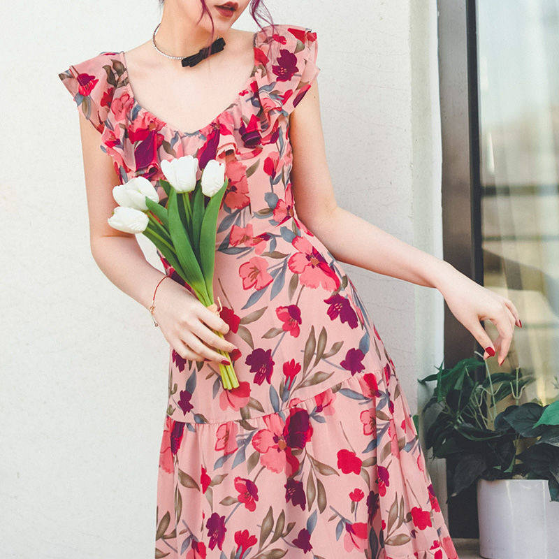 安妮不火 荷叶边连衣裙子 复古甜妹风碎花V领高腰雪纺裙女微胖大码