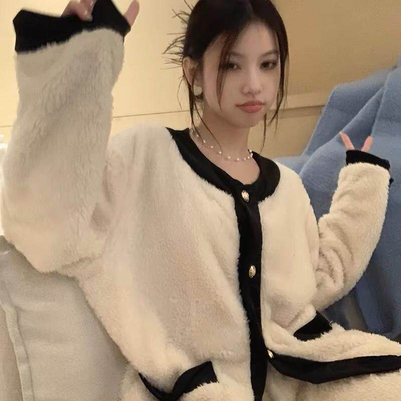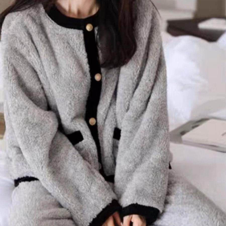 网红小香风珊瑚绒保暖睡衣女秋冬天长袖 开衫 法兰绒可外穿套装 长裤