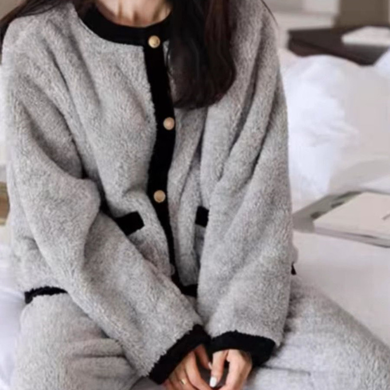网红小香风珊瑚绒保暖睡衣女秋冬天长袖 开衫 法兰绒可外穿套装 长裤由