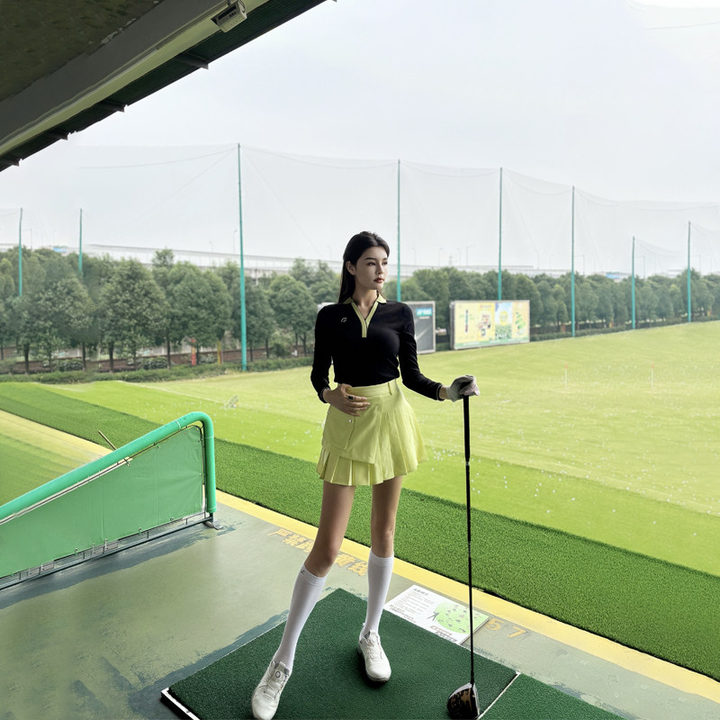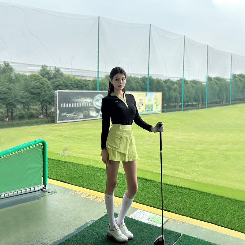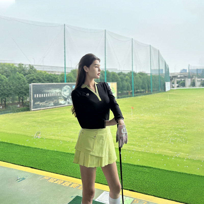 T恤修身 高尔夫服装 女秋冬翻领POLO衫 长袖 显瘦v领上衣百褶短裙套装
