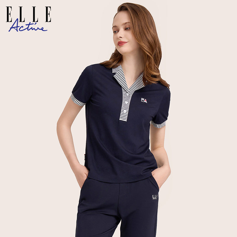 条纹翻领短袖 t恤女夏简约松驰polo领上衣正肩显瘦 Active法式 ELLE