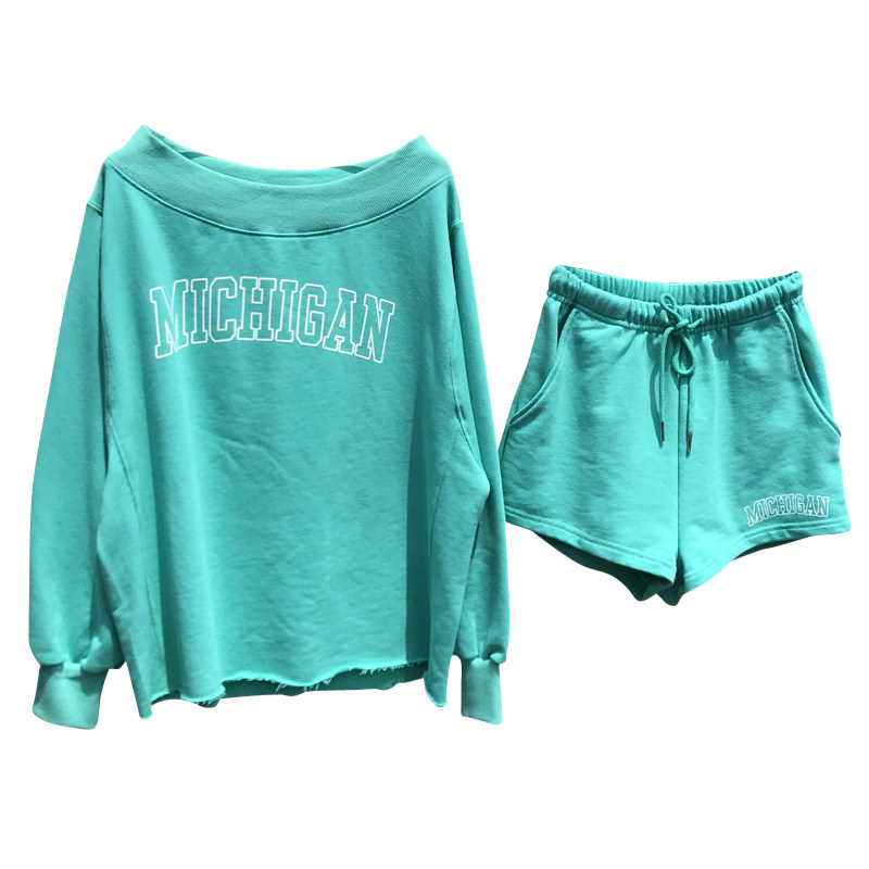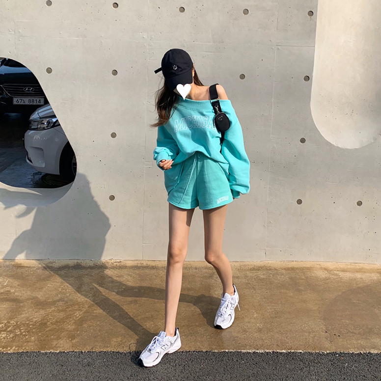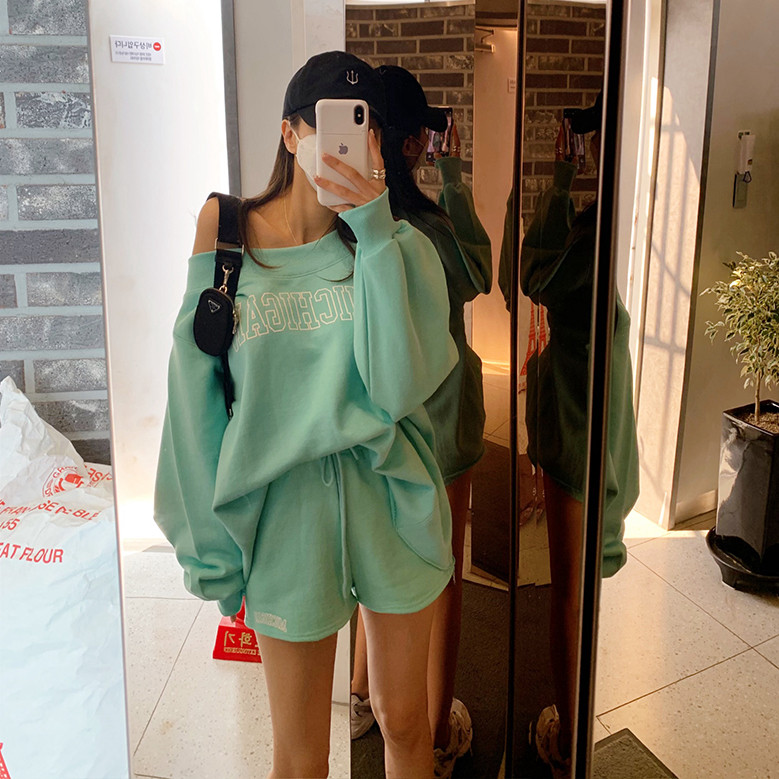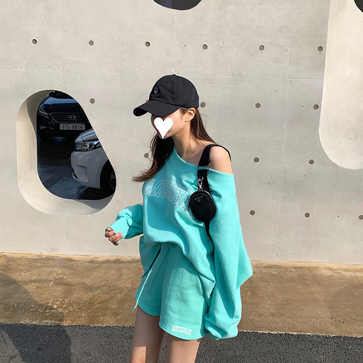 韩国东大门露肩卫衣女2025新款 运动休闲短裤 两件套装 宽松洋气时尚
