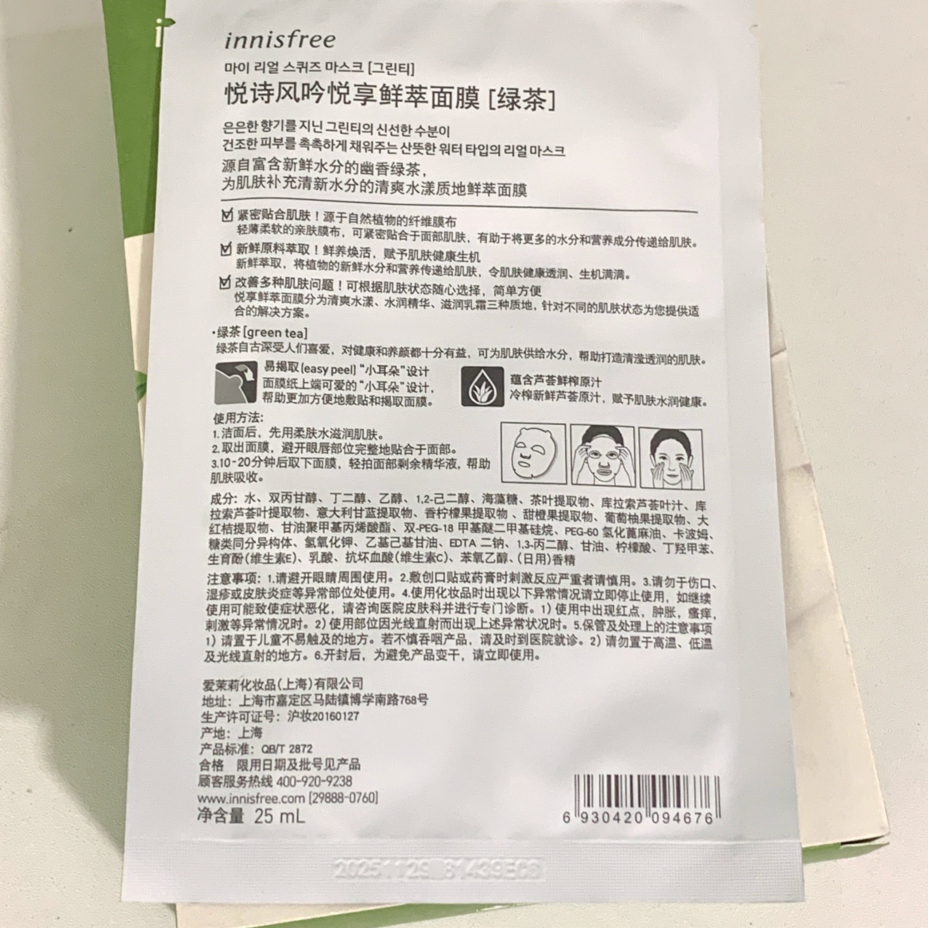 悦诗风吟悦享鲜萃面膜绿茶补水保湿 修护贴片 innisfree 便宜甩了由