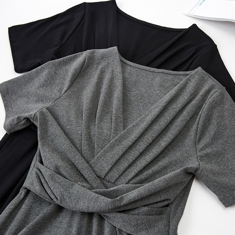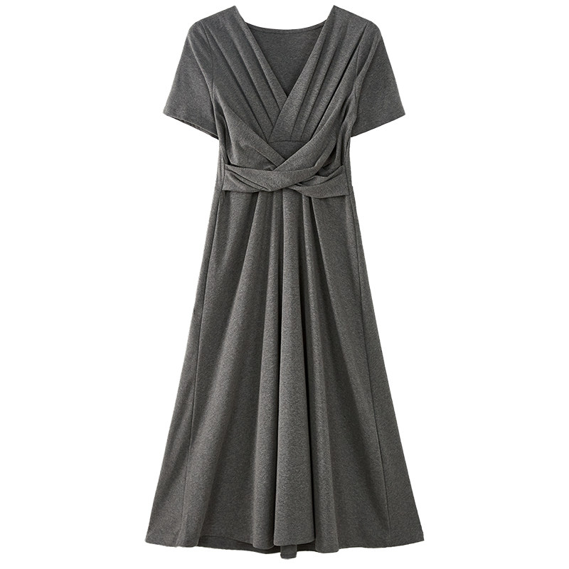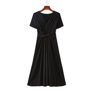 新款 褶皱加长款 V领纯棉修身 短袖 体恤打底内搭连衣裙女装 韩版 夏季由