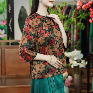 百合芳菲三重门新款 真丝唐装 香云纱七分袖 上衣复古妈妈高级女 夏季