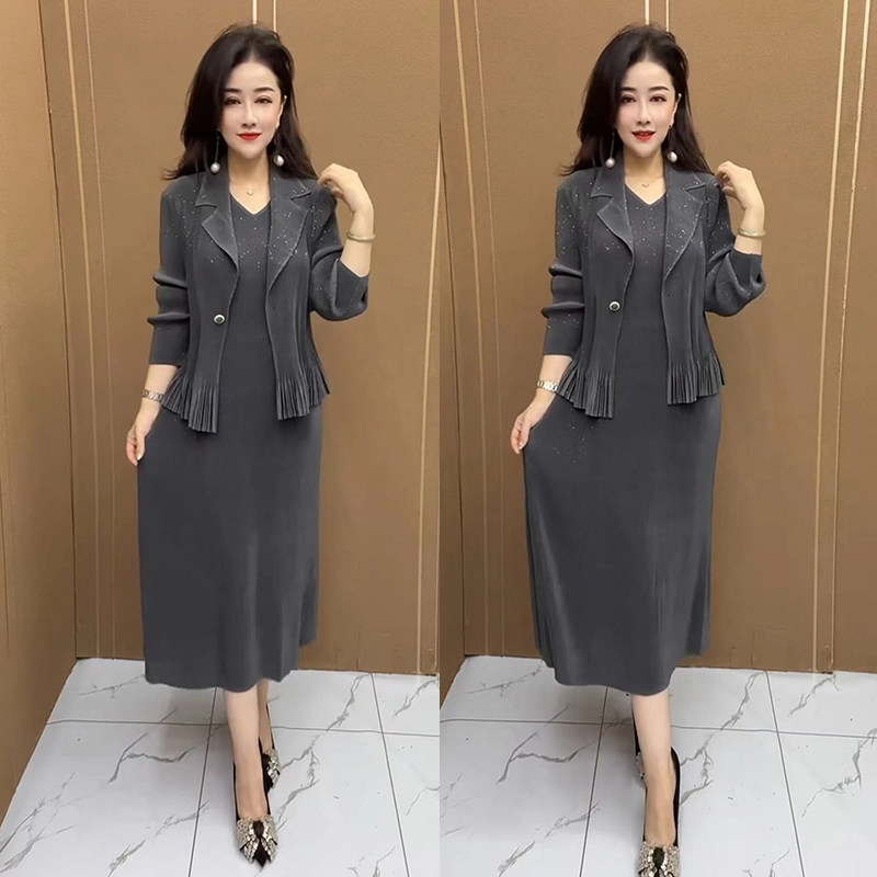 三宅褶皱西装 两件套裙收腰显瘦春秋新款 弹力连衣裙套装 领系流苏款