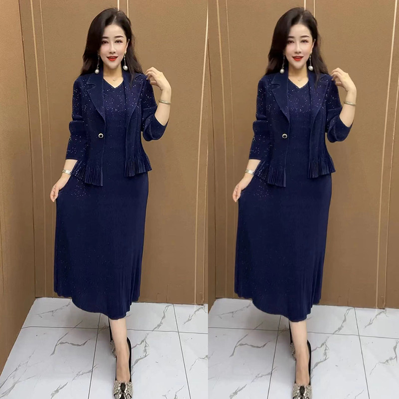 为您提供商品三宅褶皱西装 两件套裙收腰显瘦春秋新款 弹力连衣裙套装 领系流苏款的详细介绍,