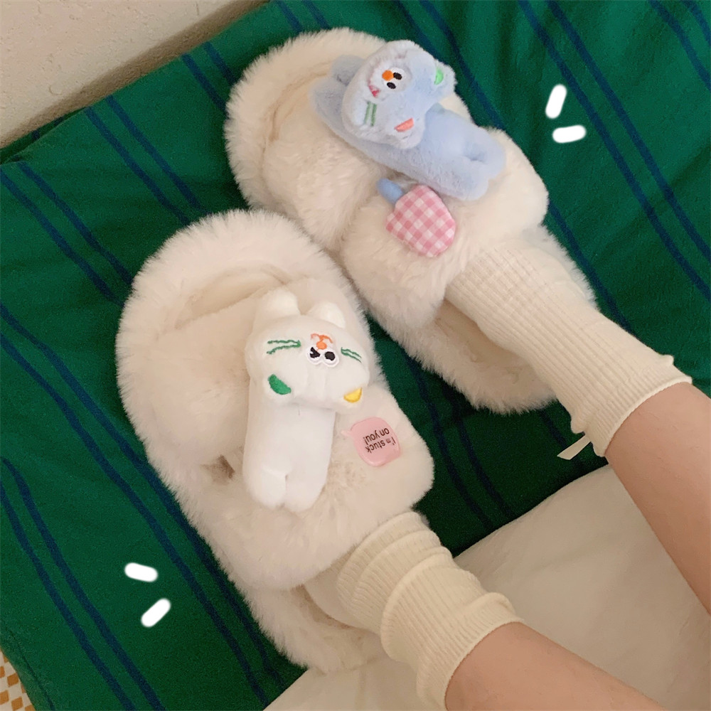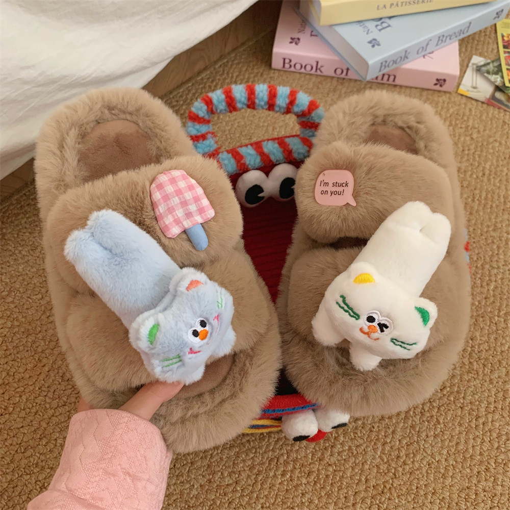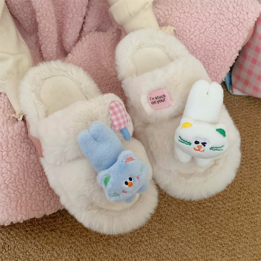 细细条 趣味可爱冬季 室内外穿百搭二字棉拖鞋 女 蓝白小猫毛毛拖鞋